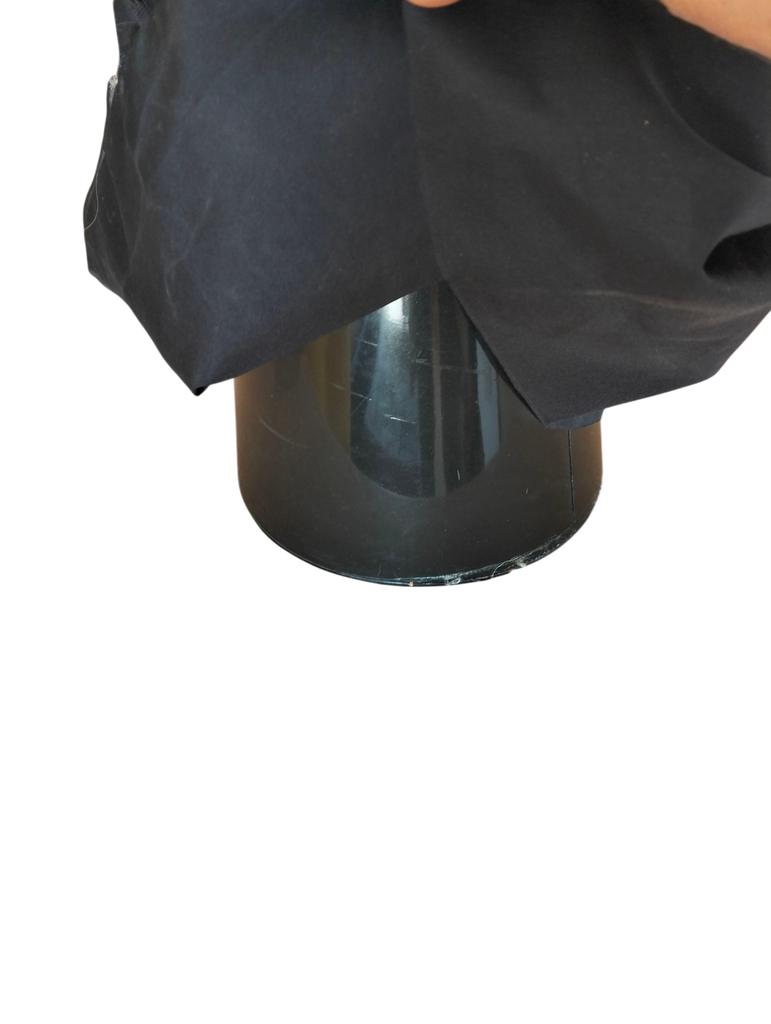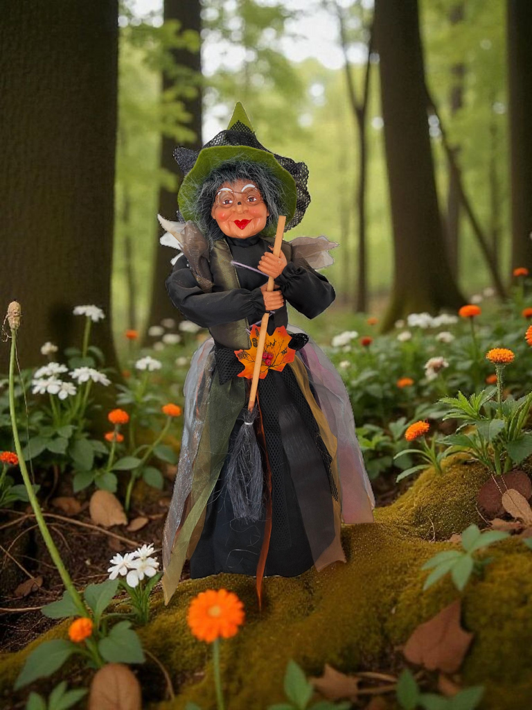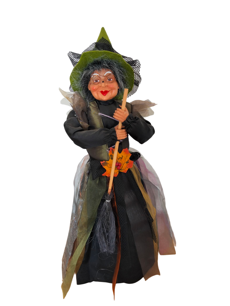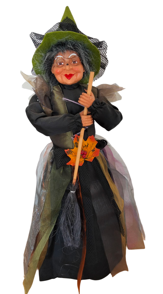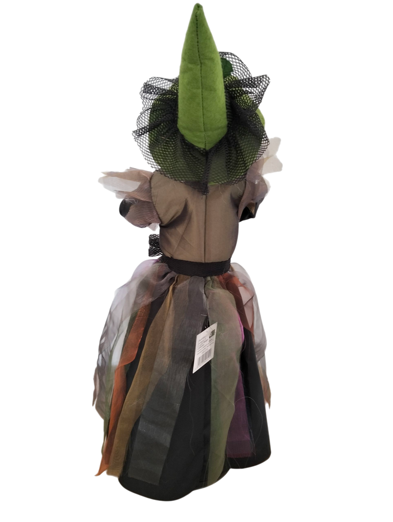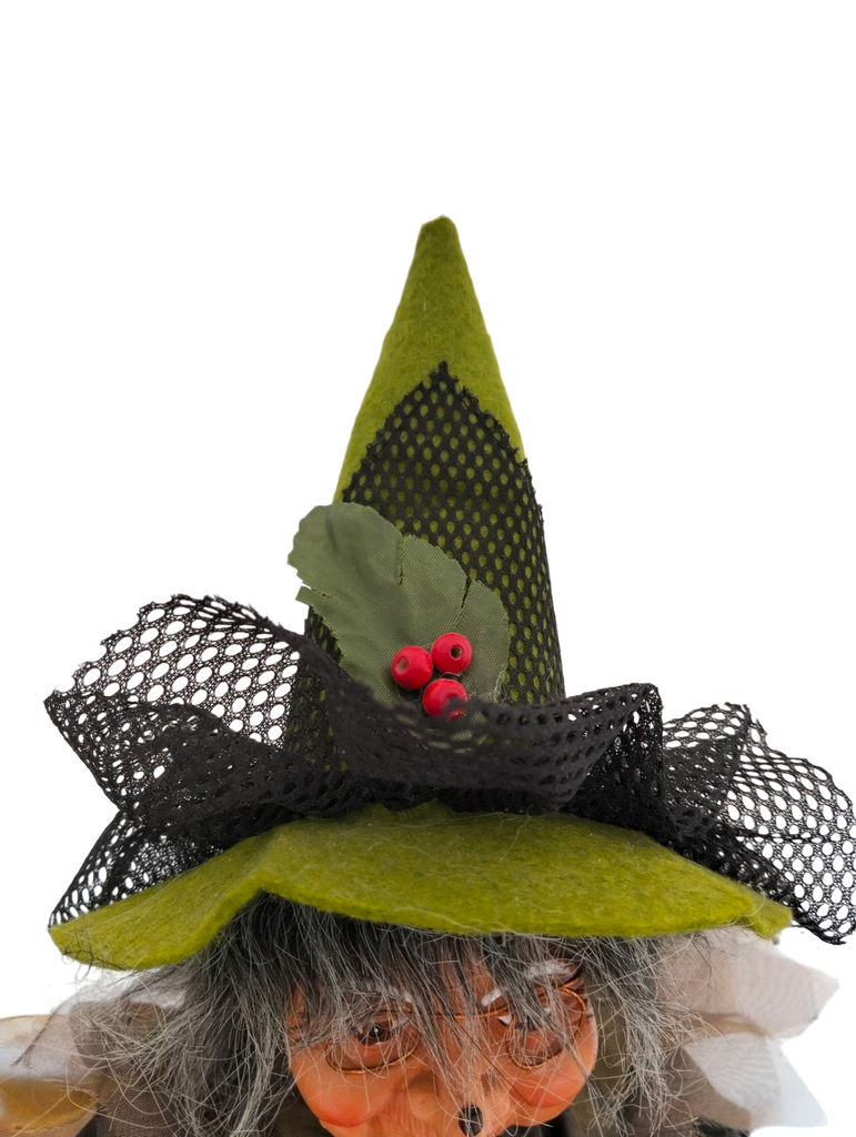 Befana in stoffa, con viso e mani in plastica, su base conica.