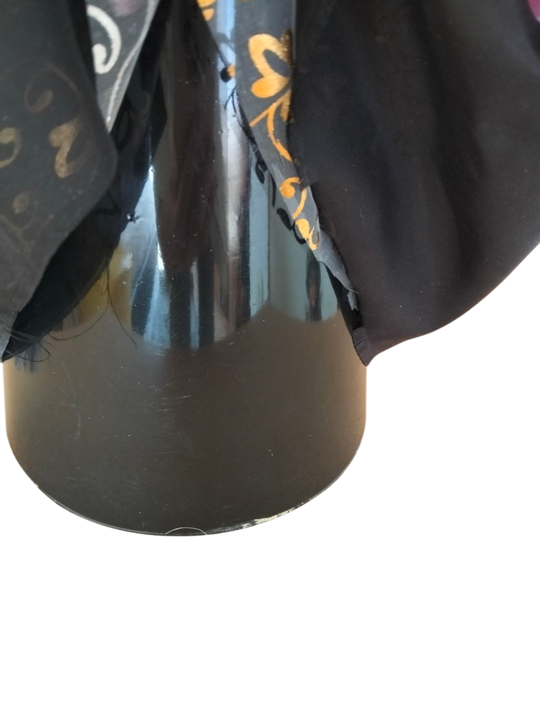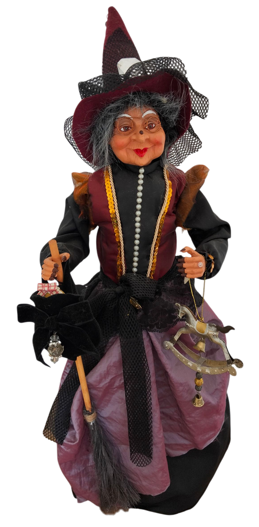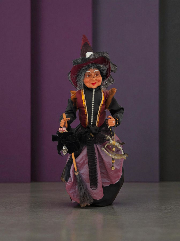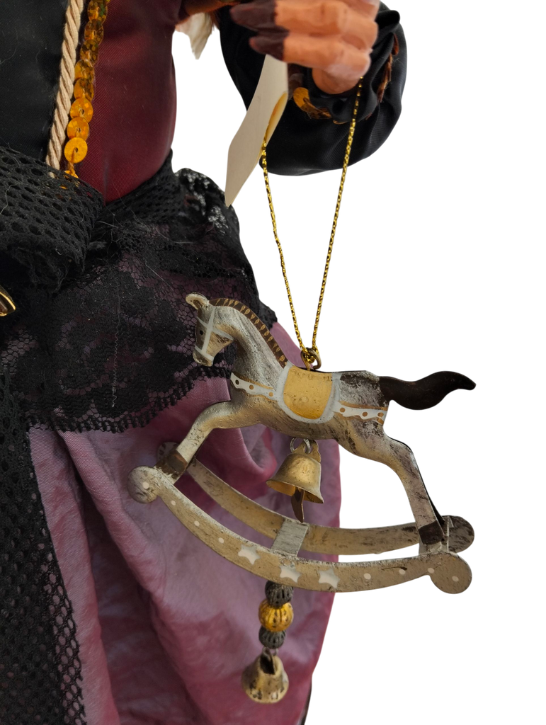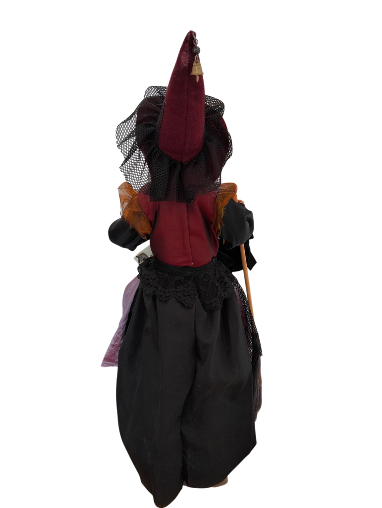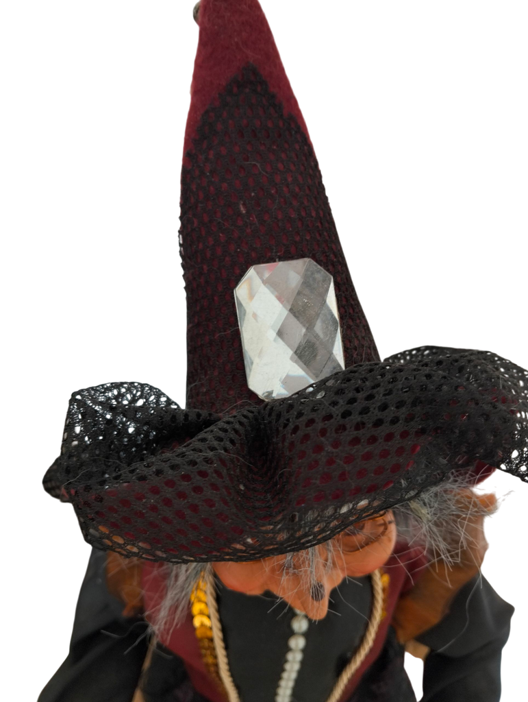 Befana elegante in stoffa, con mani e viso in resina, su base conica in plastica.