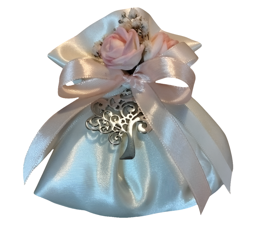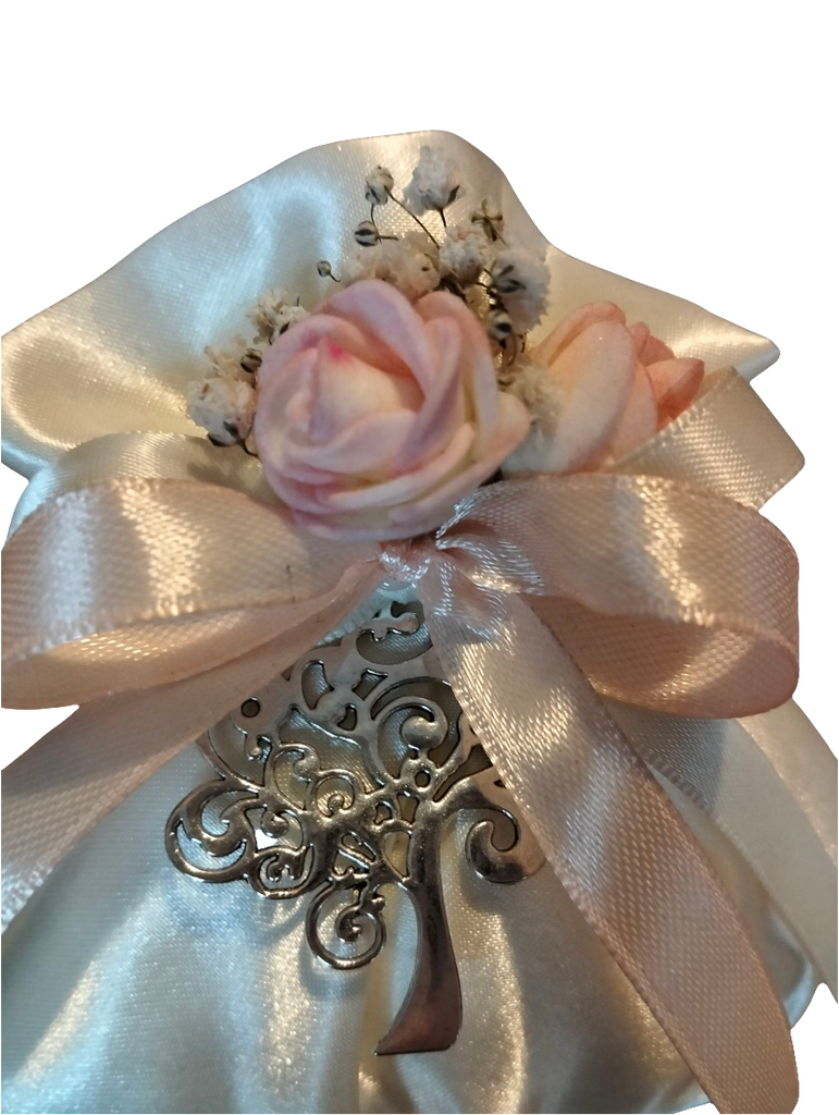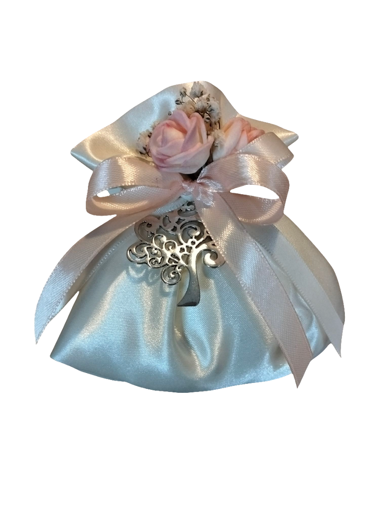 BOMBONIERA IN RASO CON APPLICAZIONE ALBERO DELLA VITA, IN METALLO. ALL'INTERNO CONFETTI CONFEZIONATI E BIGLIETTINO (IN ALTERNATIVA TAG ESTERNO)