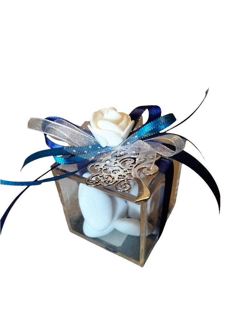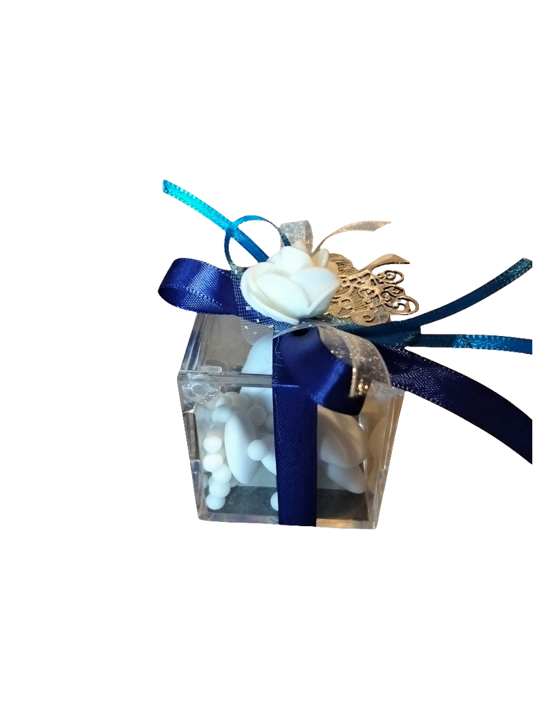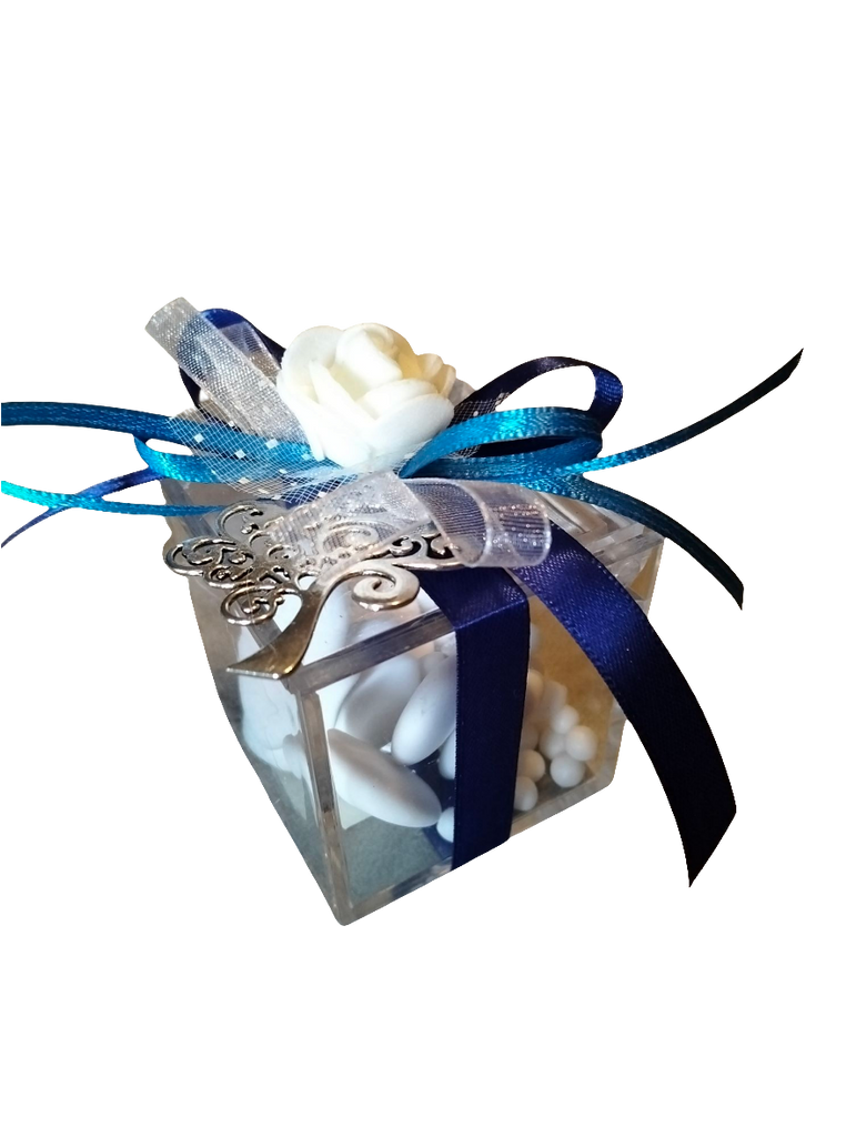 BOMBONIERA CUBO IN PLEXIGLAS CON APPLICAZIONE ALBERO DELLA VITA, IN METALLO. ALL'INTERNO CONFETTI, PERLE DI ZUCCHERO E BIGLIETTINO (IN ALTERNATIVA TAG ESTERNO.