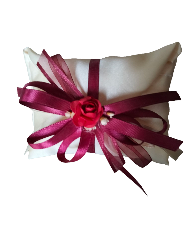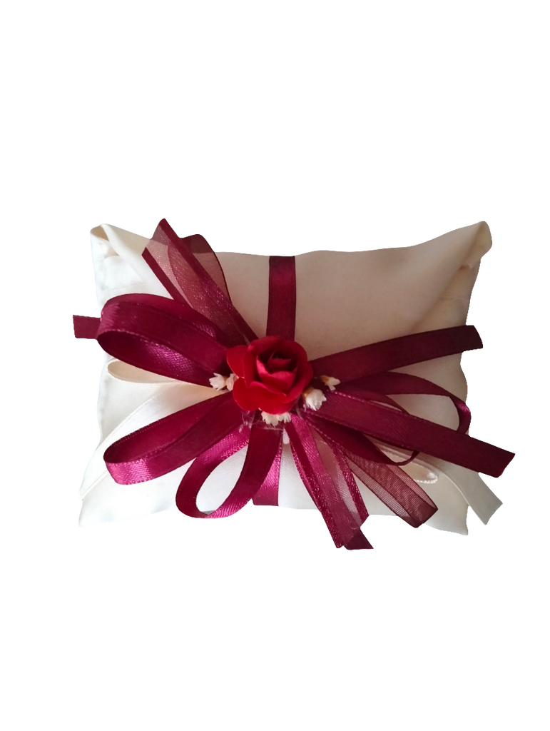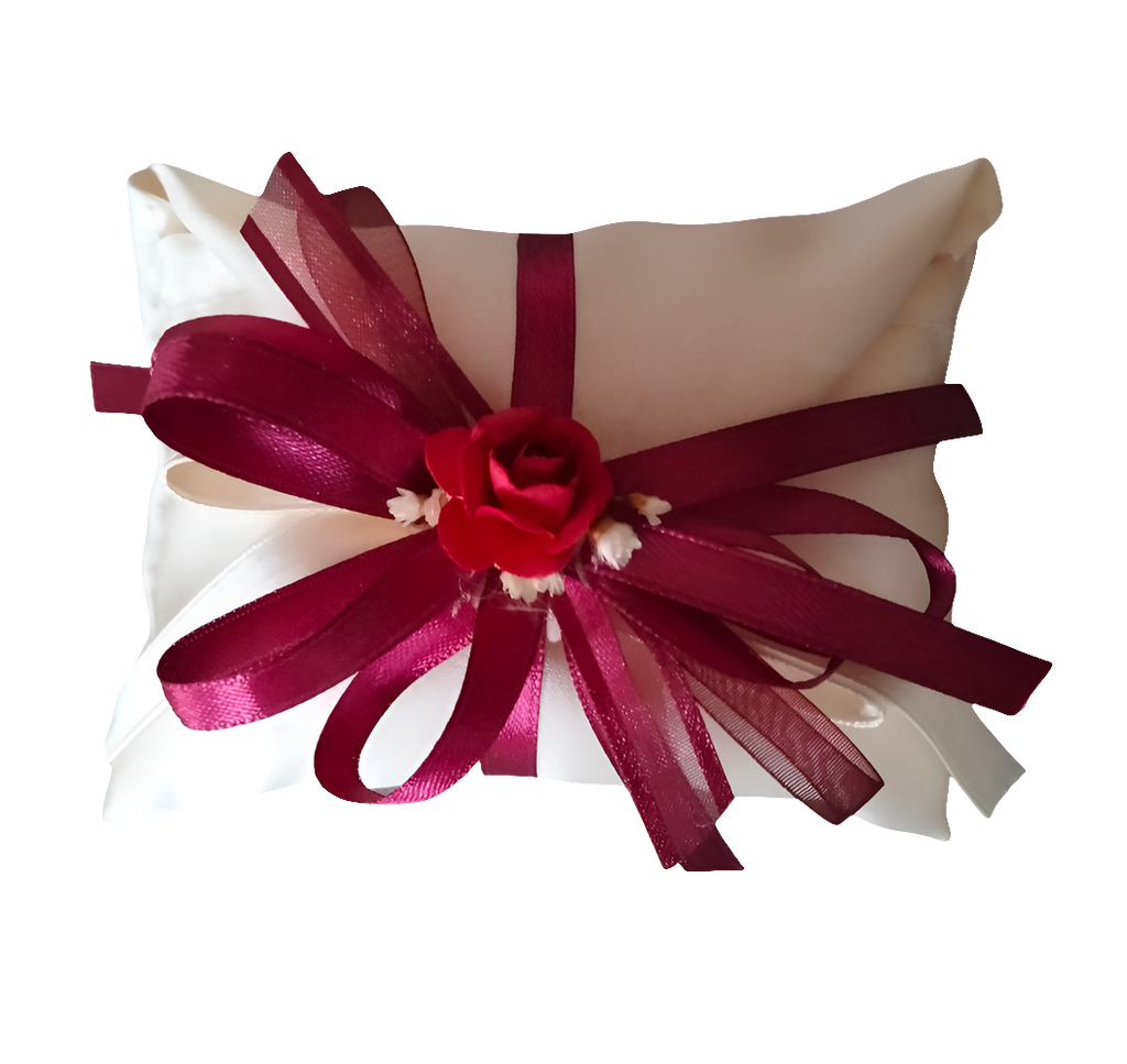 BOMBONIERA IN RASO CON NASTRI BORDEAUX . ALL'INTERNO CONFETTI CONFEZIONATI E BIGLIETTINO ( IN ALTERNATIVA TAG ESTERNO)