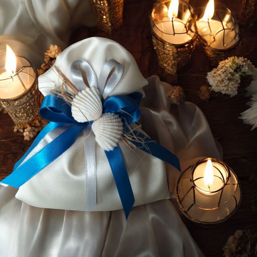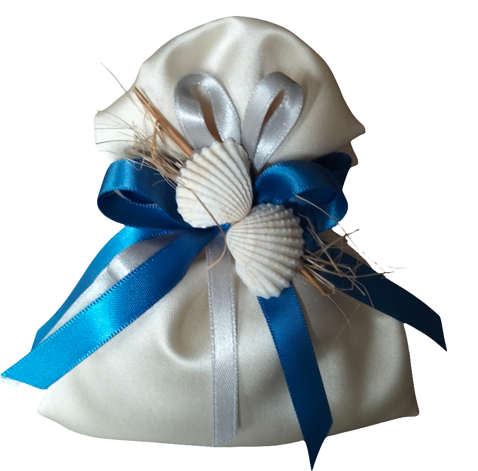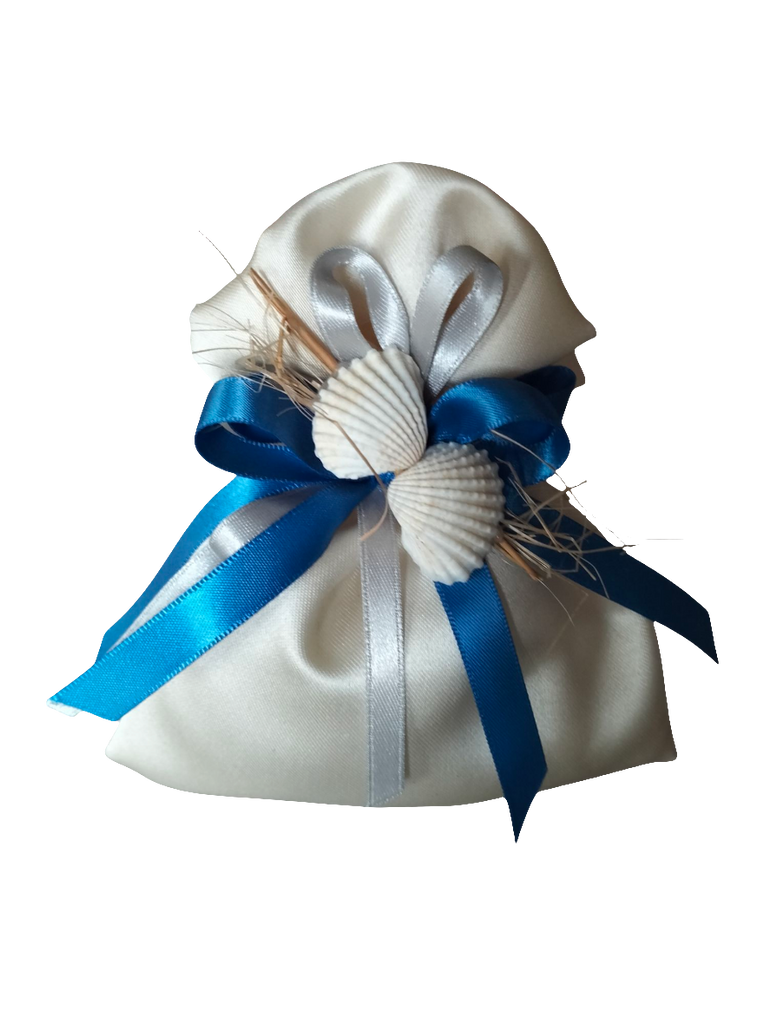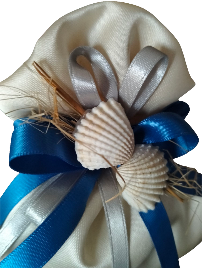 BOMBONIERA IN RASO CON APPLICAZIONE CONCHIGLIE . ALL'INTERNO CONFETTI CONFEZIONATI E BIGLIETTINO. ( IN ALTERNATIVA TAG ESTERNO) Nella foto è indicativo il nastro argento a contrasto. In alternativa proponiamo nastro avorio.