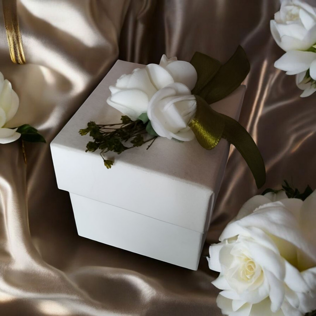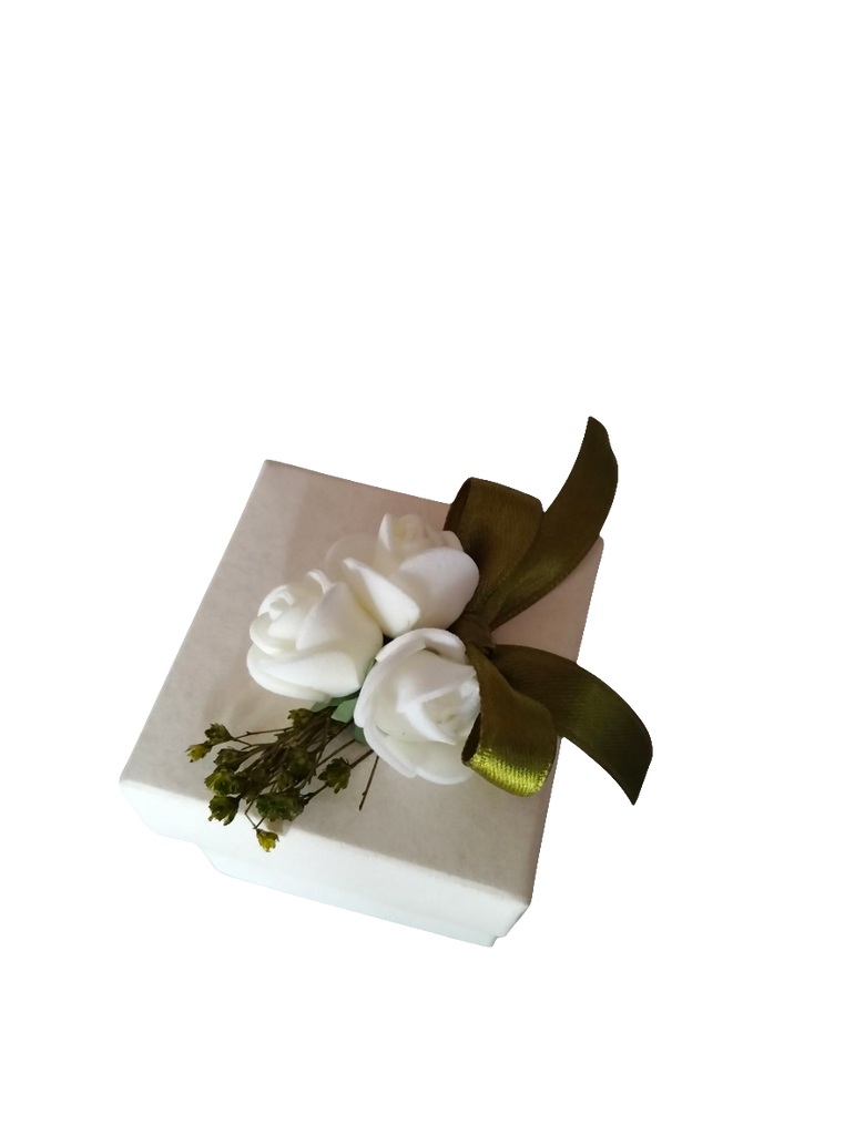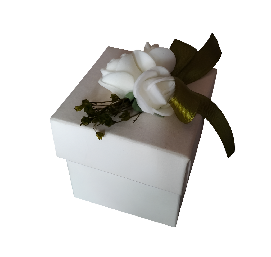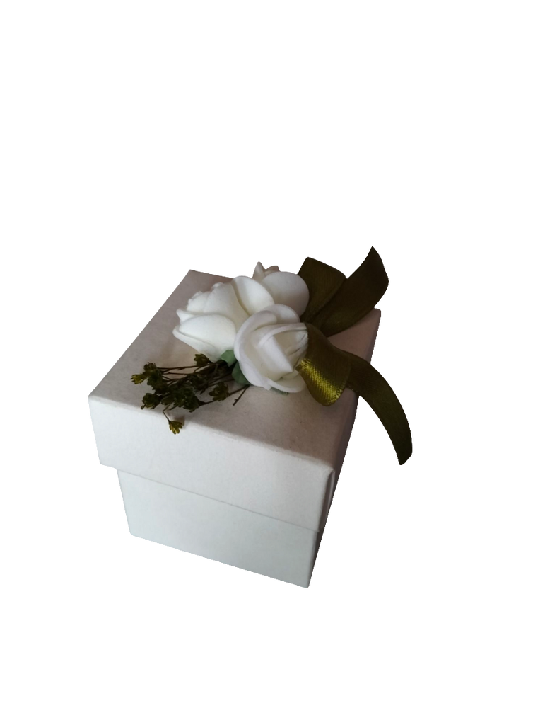 BOMBONIERA SCATOLA IN CARTA CON APPLICAZIONE ROSE IN LATTICE. ALL'INTERNO CONFETTI CONFEZIONATI E BIGLIETTINO.