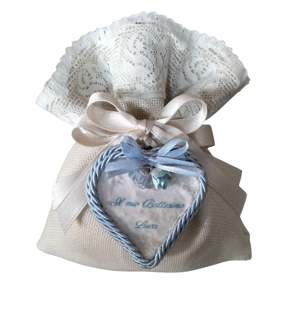 BOMBONIERA BATTESIMO MASCHIETTO, COMPOSTA DA SACCHETTO IN COTONE CON E PIZZO , CON TARGHETTA FORMA DI CUORE PERSONALIZZATA.