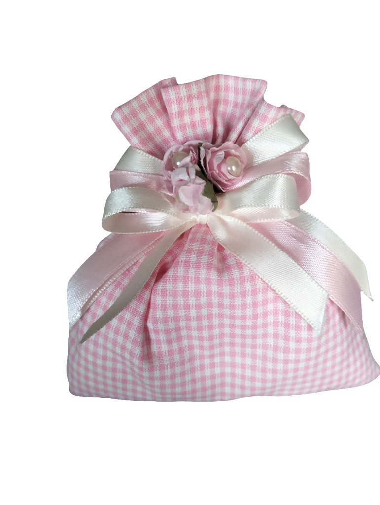 BOMBONIERA IN COTONE CON APPLICAZIONE ROSELLINE CON PERLINA. ALL'INTERNO CONFETTI CONFEZIONATI E BIGLIETTINO INTERNO ( IN ALTERNATIVA TAG ESTERNO)