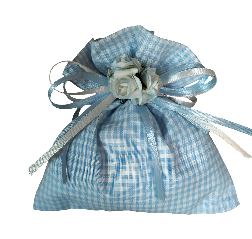 BOMBONIERA BATTESIMO IN COTONE CON ROSELLINE ALL'INTERNO CONFETTI CONFEZIONATI E BIGLIETTINO (IN ALTERNATIVA TAG ESTERNO)