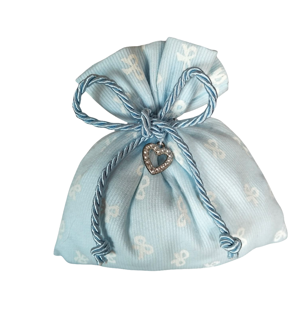 BOMBONIERA BATTESIMO IN COTONE A RIGHE CELESTI CON APPLICAZIONE CUORE IN METALLO E STRASS. ALL'INTERNO CONFETTI CONFEZIONATI E BIGLIETTINO.