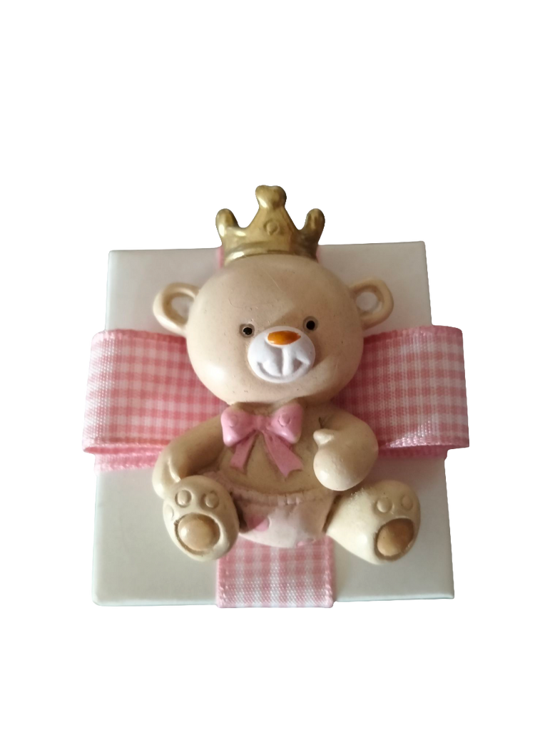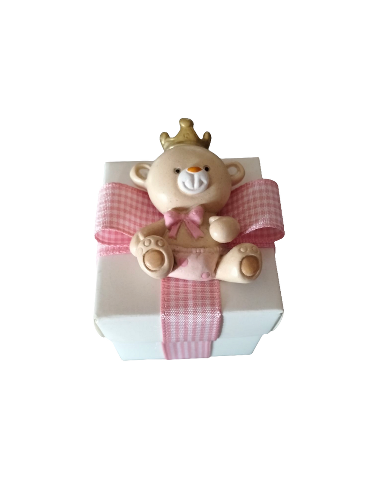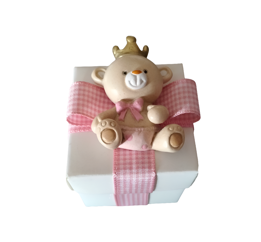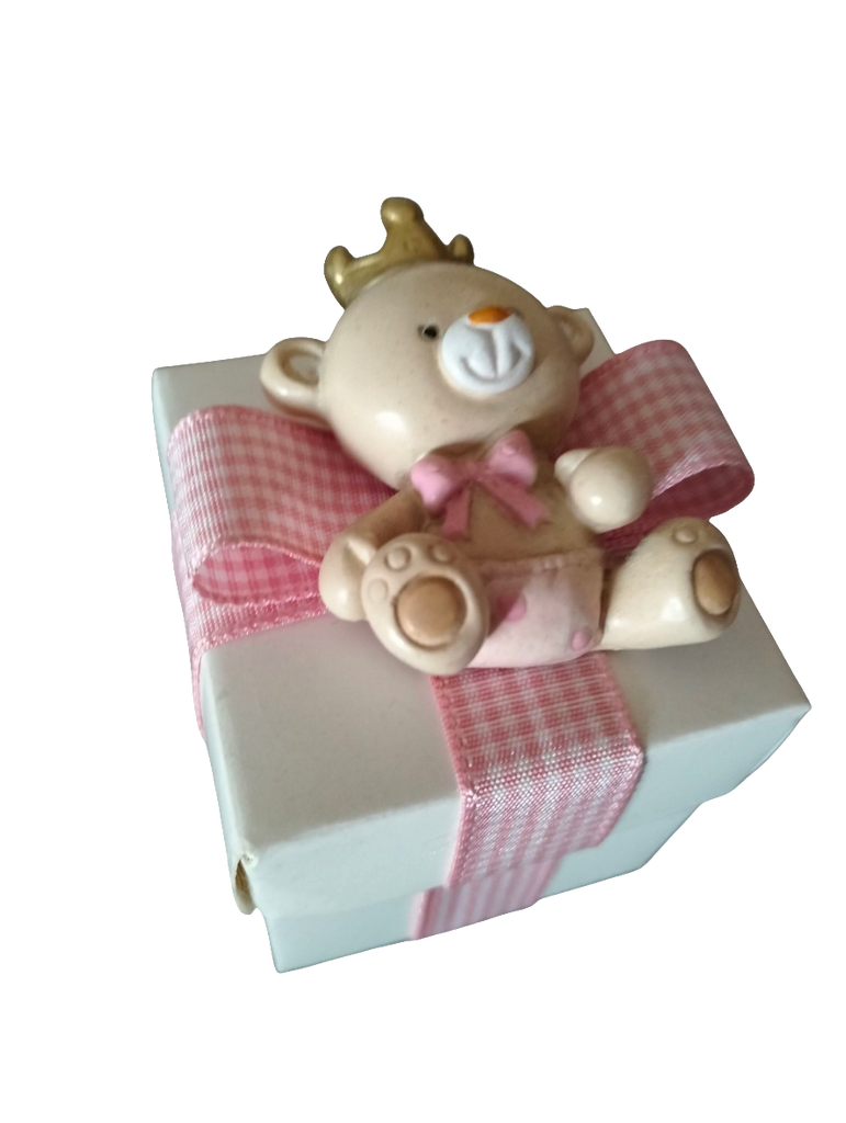 BOMBONIERA BATTESIMO SCATOLA IN CARTA, CON APPLICAZIONE ORSETTO IN RESINA. ALL'INTERNO CONFETTI CONFEZIONATI E BIGLIETTINO