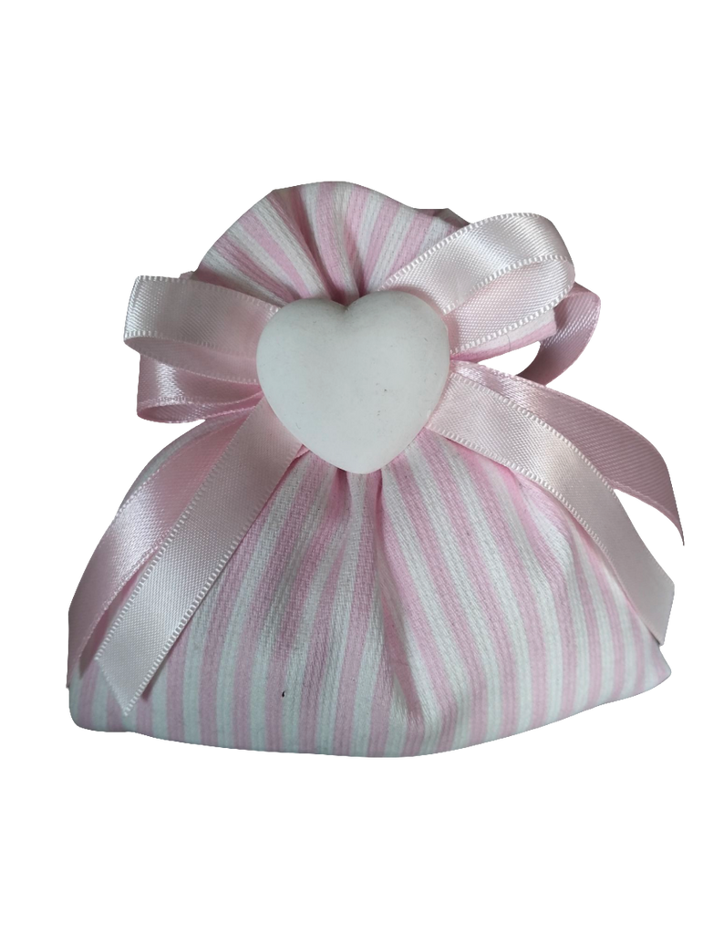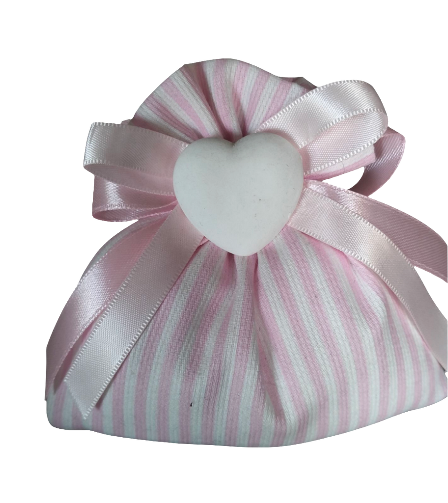 BOMBONIERA IN COTONE CON APPLICAZIONE CUORE IN GESSO. ALL'INTERNO CONFETTI CONFEZIONATI E BIGLIETTINO( IN ALTERNATIVA TAG ESTERNO)