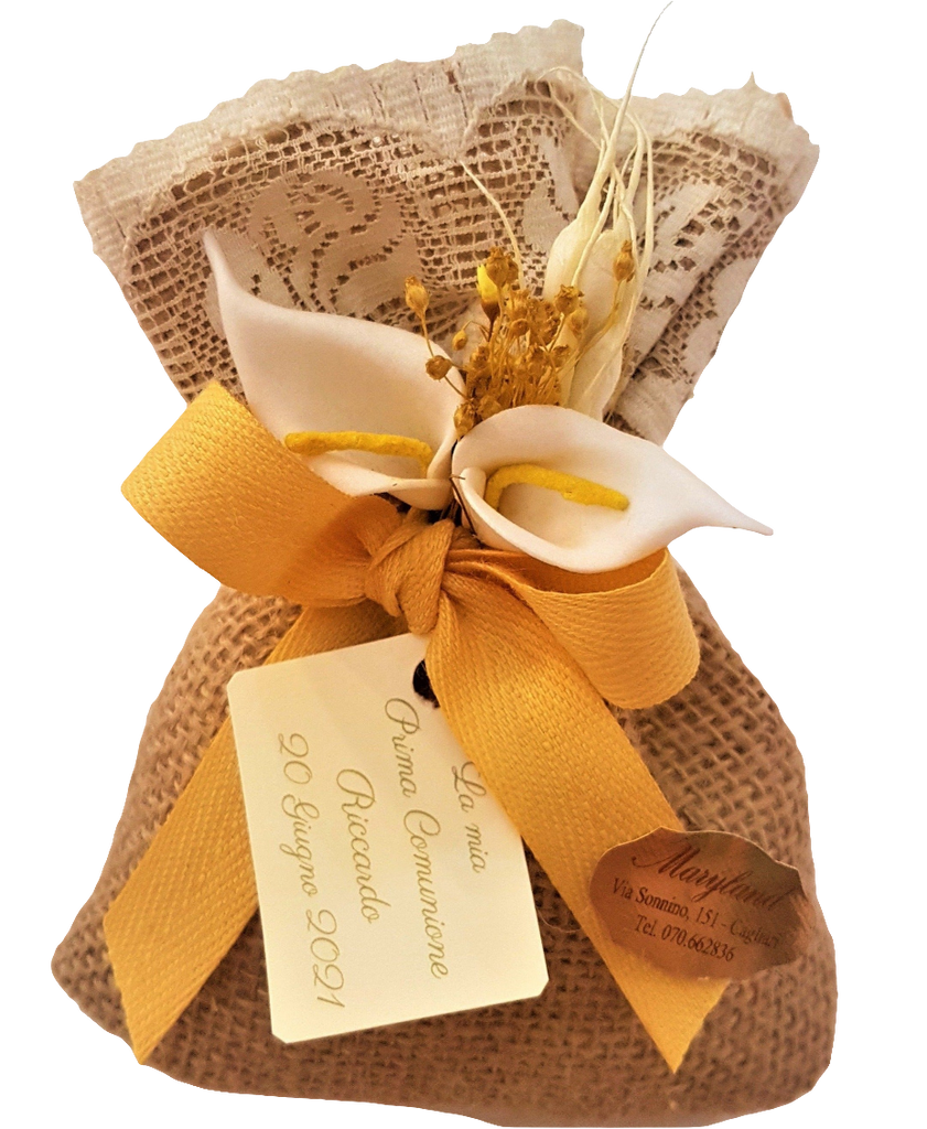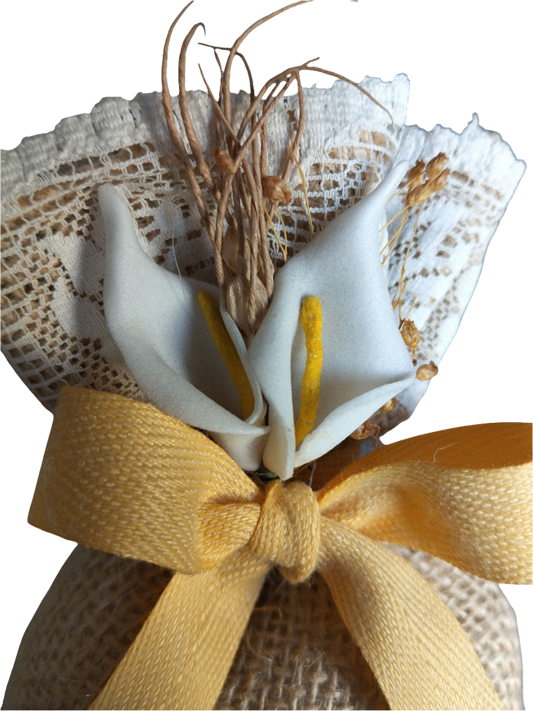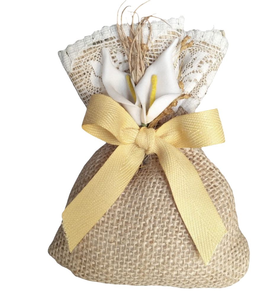 BOMBONIERA COUNTRY SACCHETTO IN JUTA E PIZZO, CON DECORAZIONE CALLE E SPIGA, IDEALE PER COMUNIONE, CRESIMA, MATRIMONIO. LA CONFEZIONE COMPRENDE I CONFETTI E IL TAG ESTERNO COL NOME E LA DATA. POSSIBILITÀ DI VARIARE IL NASTRO.