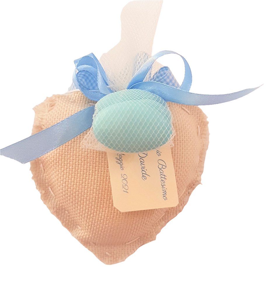 BOMBONIERA A FORMA DI CUORE IN COTONE ECRU' CON CUCITURE A VISTA, NASTRO VICHY CELESTE E APPLICAZIONE DI ANGELO IN GESSO.