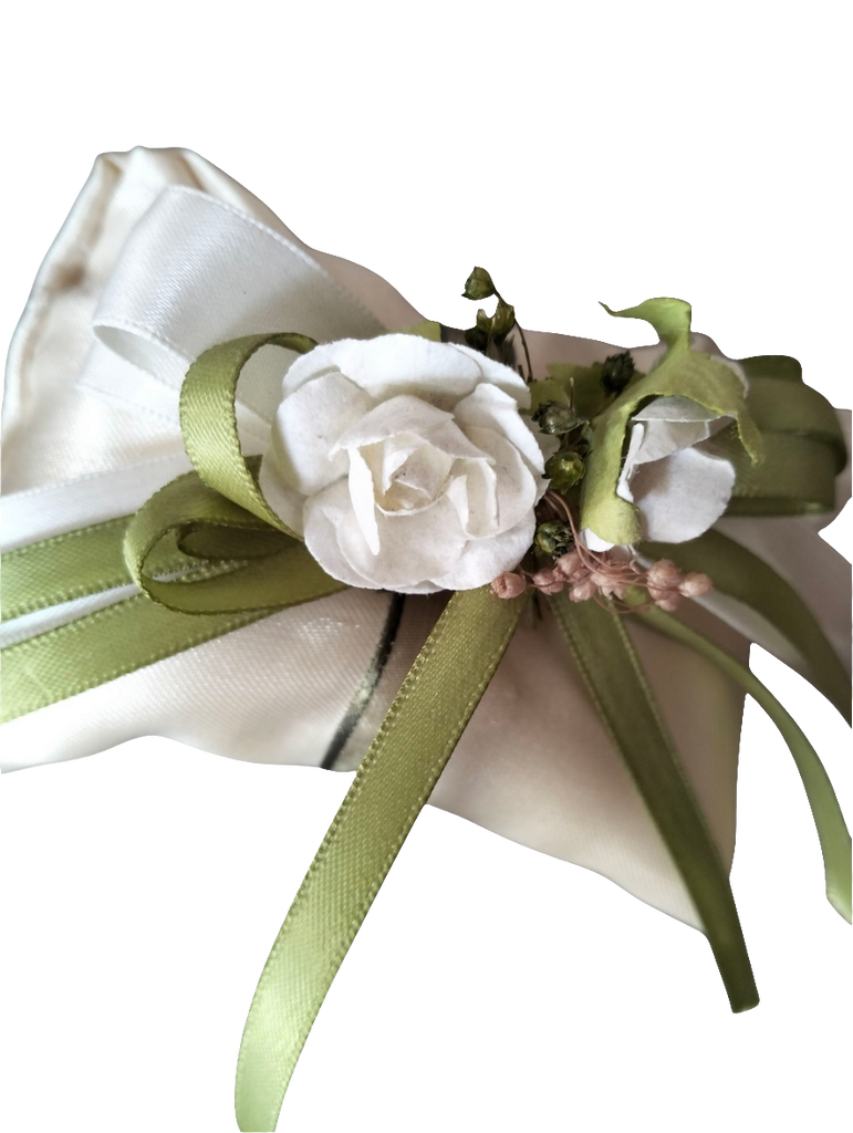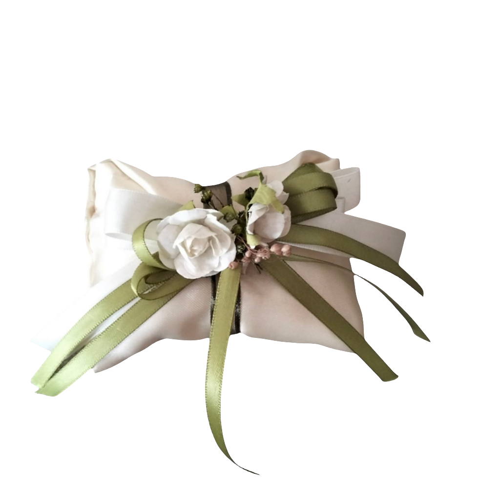 BOMBONIERA CUSCINO IN RASO CON NASTRO VERDE E ROSE. CONFEZIONE COMPLETA DI CONFETTI E BIGLIETTINO INTERNO.