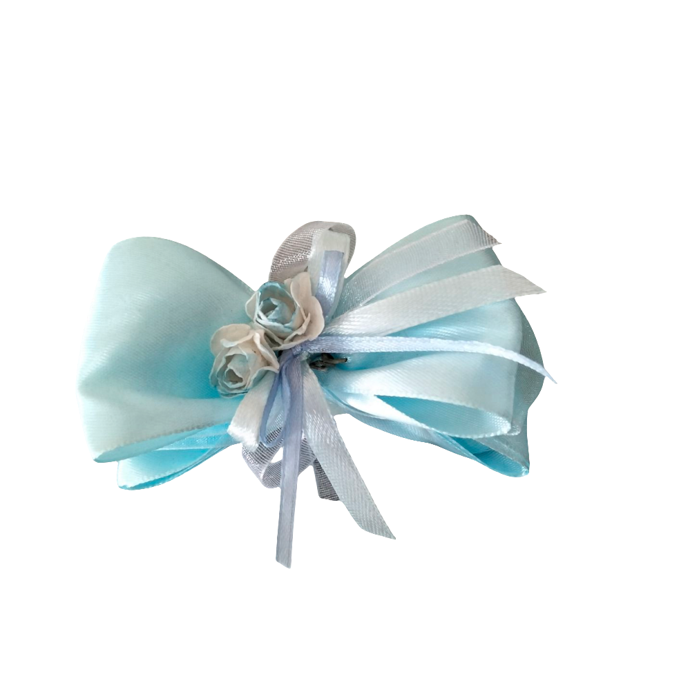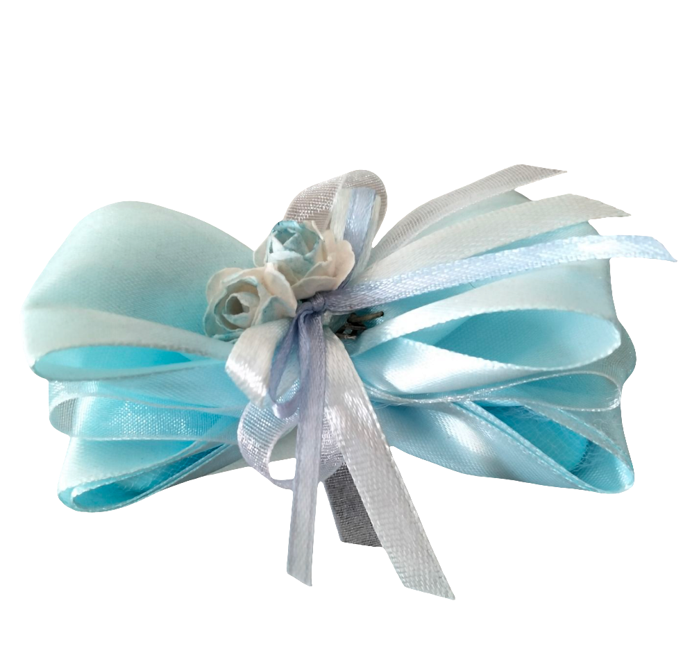 BOMBONIERA A FORMA DI FIOCCO CELESTE CON NASTRI CELESTI E ROSELLINE IN TINTA. CONFETTI E BIGLIETTINO ALL'INTERNO O TAG ESTERNO