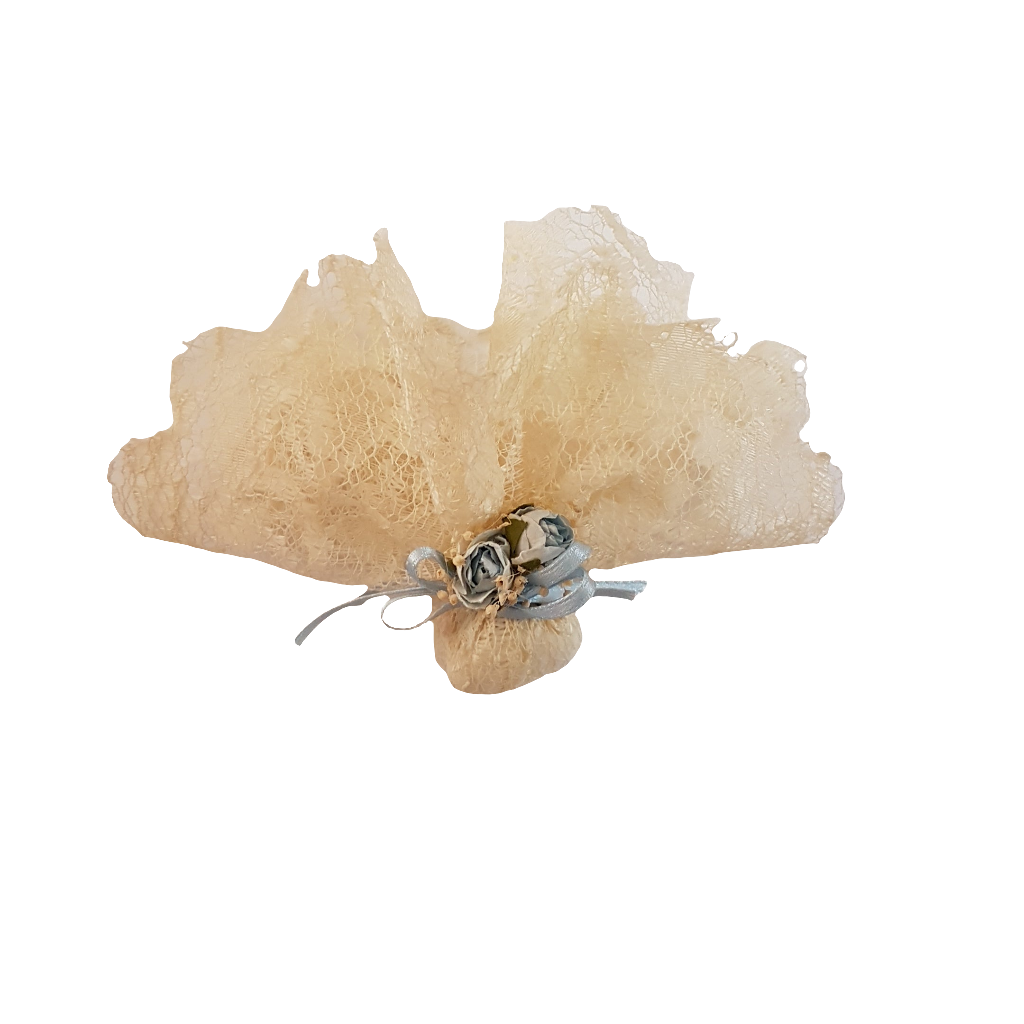 BOMBONIERA IN PIZZO CLASSICA COLORE AVORIO CON ROSELLINE E NASTRI IN RASO CELESTI. PER BATTESIMO BIMBO