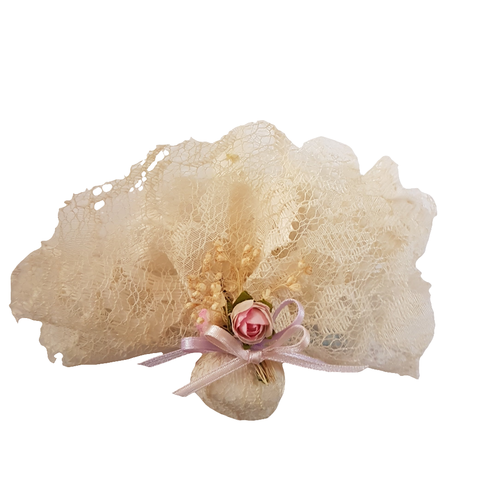 BOMBONIERA IN PIZZO CLASSICA COLORE AVORIO CON ROSELLINE E NASTRI IN RASO ROSA. PER BATTESIMO BIMBA