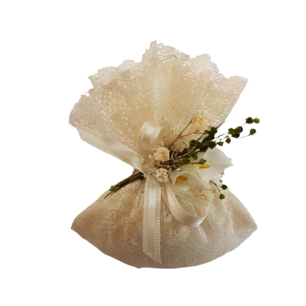 BOMBONIERA IN PIZZO AVORIO, CON APPLICAZIONE DI CALLE E MIGLIO VERDE, LEGATI CON NASTRO IN RASO AVORIO IDEALE SIA PER MATRIMONIO CHE PER COMUNIONE,CRESIMA O BATTESIMO.