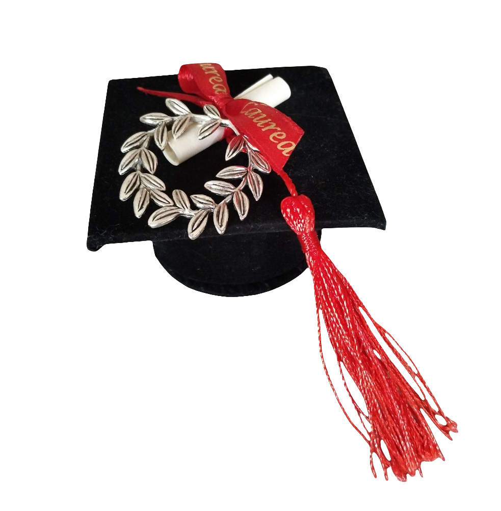 BOMBONIERA LAUREA TOCCO NERO IN VELLUTO CON APPLICAZIONE CORONA D'ALLORO IN METALLO. ALL'INTERNO CONFETTI ROSSI CONFEZIONATI E BIGLIETTINO.
