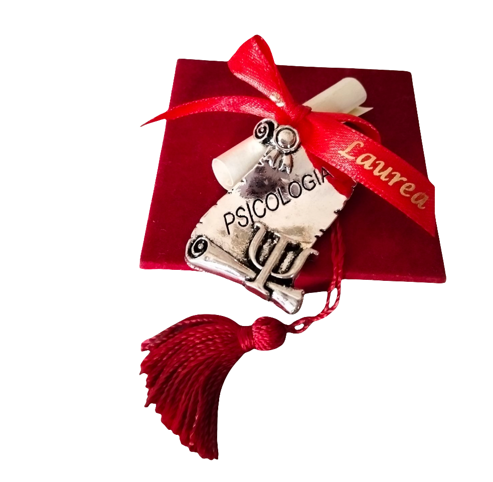 BOMBONIERA LAUREA TOCCO ROSSO IN VELLUTO CON APPLICAZIONE TARGHETTA SPECIALIZZAZIONE IN METALLO. ALL'INTERNO CONFETTI ROSSI CONFEZIONATI E BIGLIETTINO.
