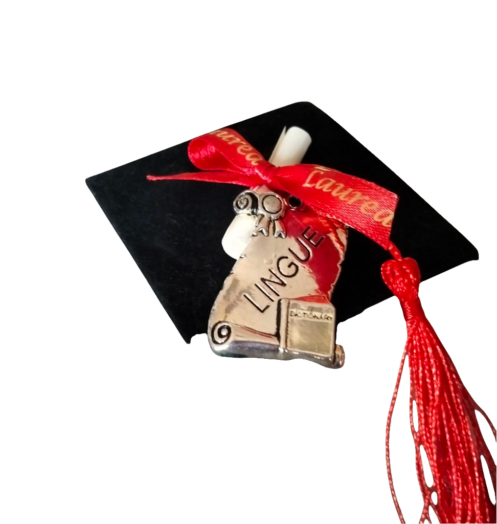 BOMBONIERA LAUREA TOCCO NERO IN VELLUTO CON APPLICAZIONE TARGHETTA SPECIALIZZAZIONE IN METALLO. ALL'INTERNO CONFETTI ROSSI CONFEZIONATI E BIGLIETTINO.