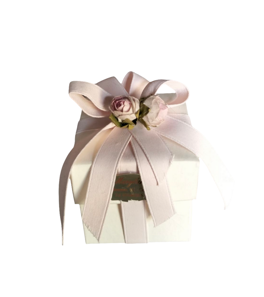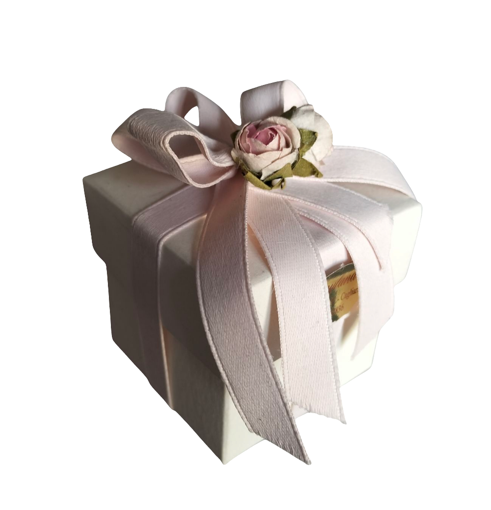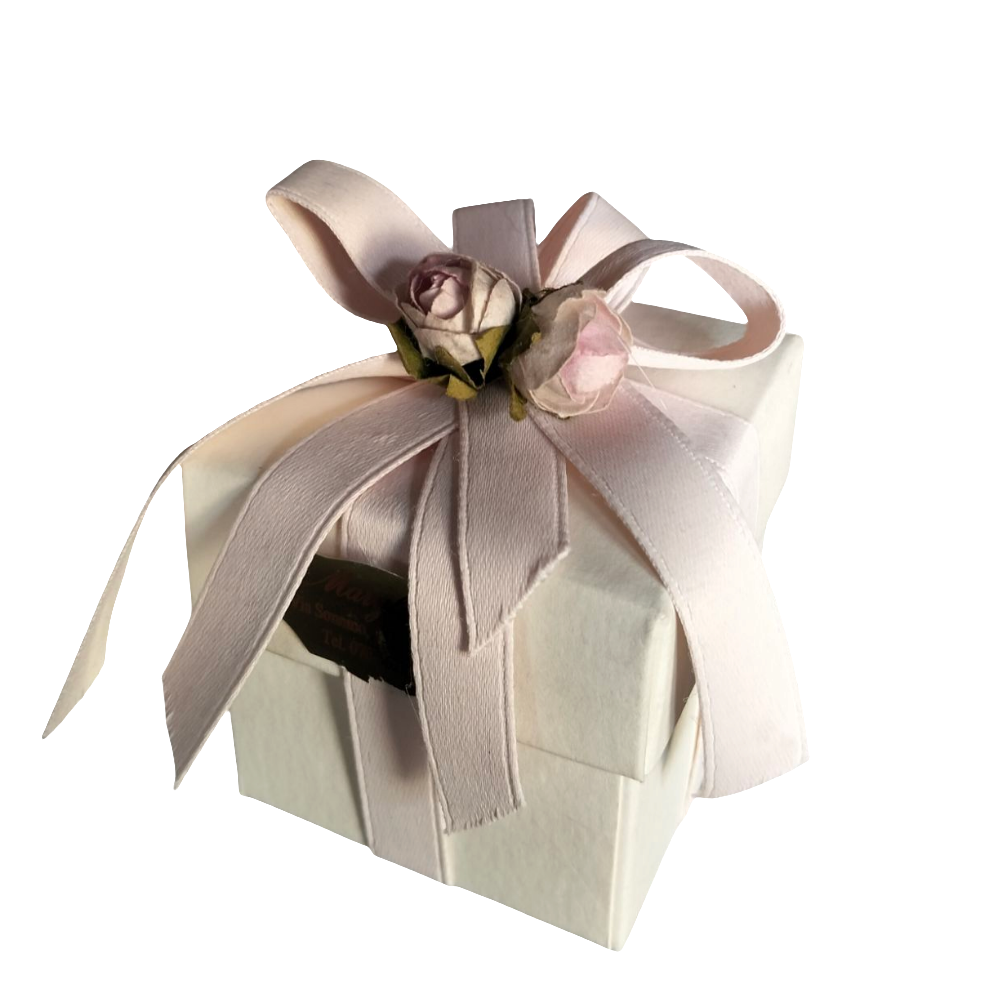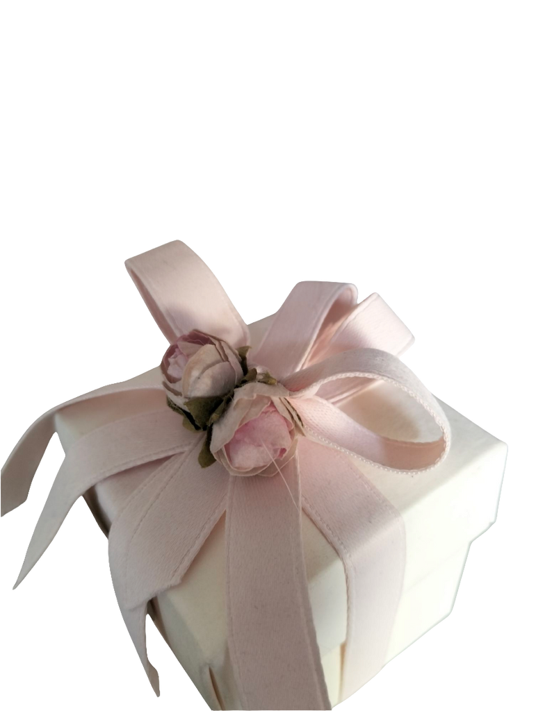 BOMBONIERA SCATOLA IN CARTA CON NASTRO ROSA PALLIDO E ROSELLINE I TINTA. CONFEZIONE COMPLETA DI CONFETTI E BIGLIETTINO.