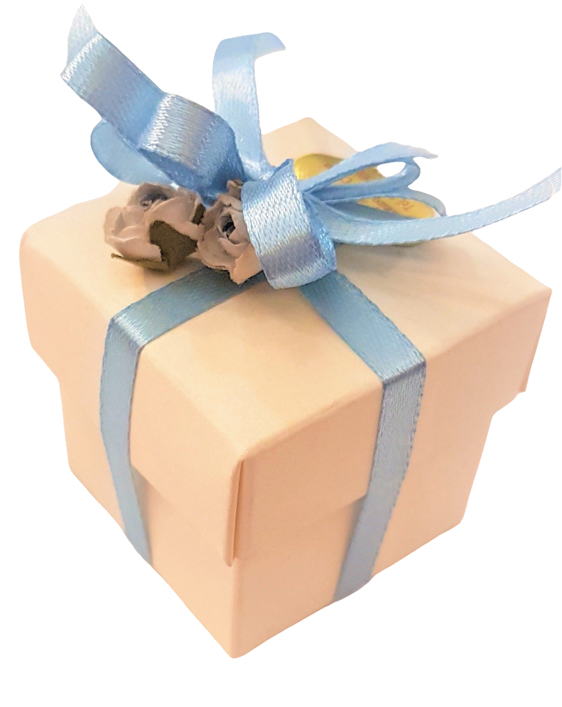 BOMBONIERA SCATOLA IN CARTONCINO AVORIO CON CELESTE E ROSELLINE IN TINTA, PER BATTESIMO BAMBINO.