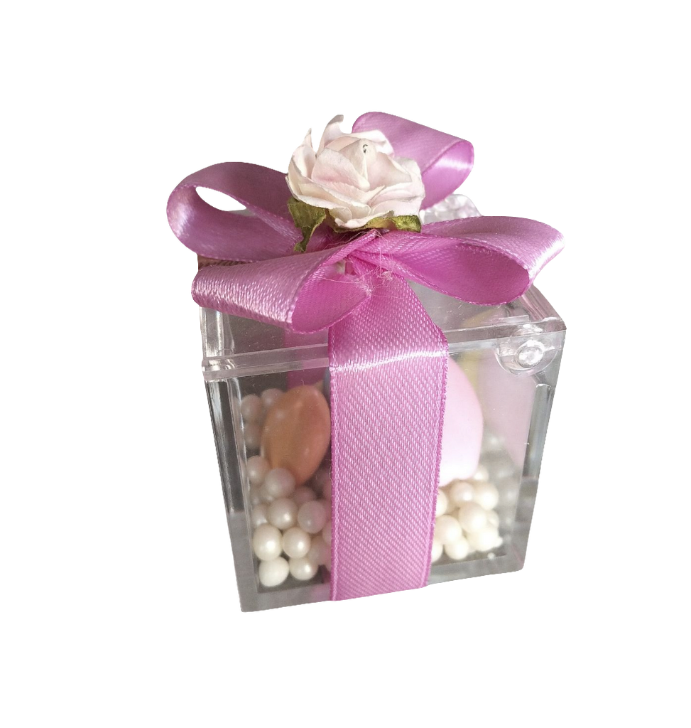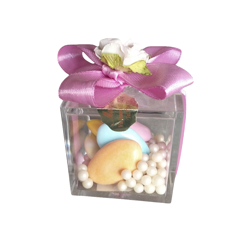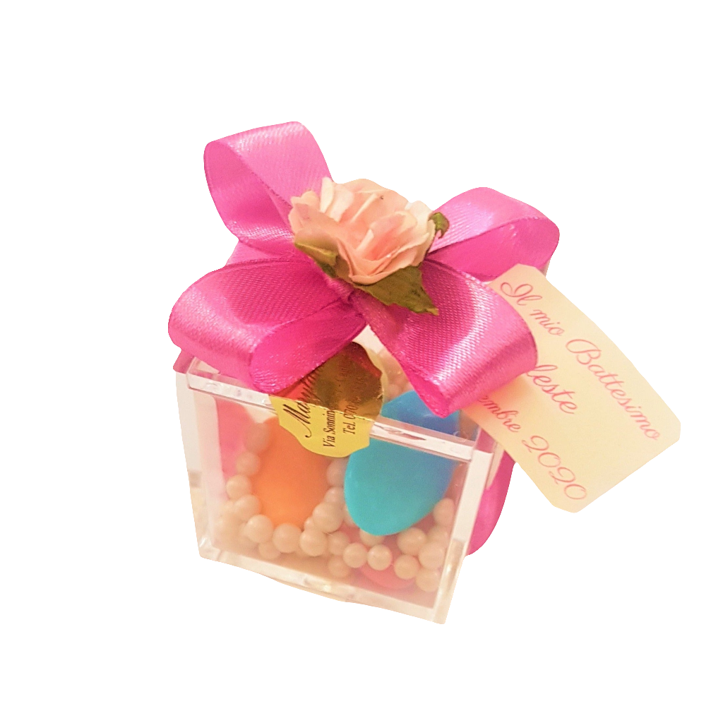 BOMBONIERA SCATOLA IN PLEXIGLASS CO CONFETTI COLORATI, PERLE DI ZUCCHERO E TAG ESTERNO COL NOME E LA DATA.