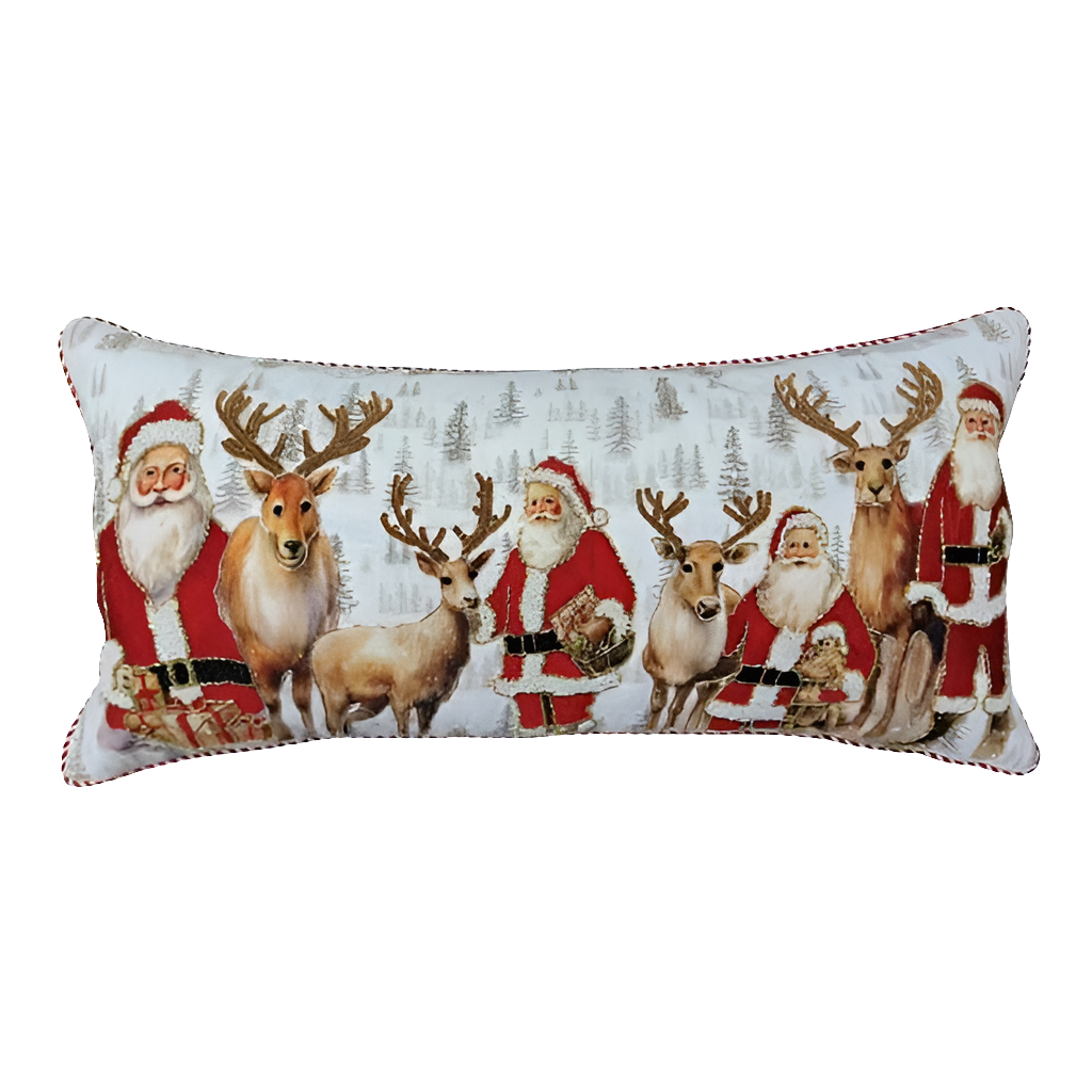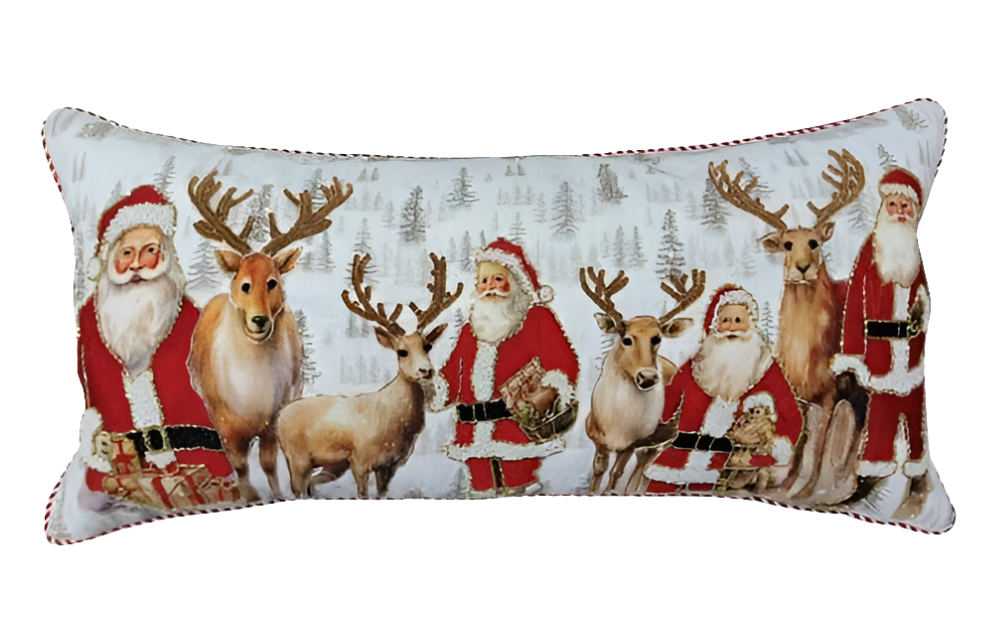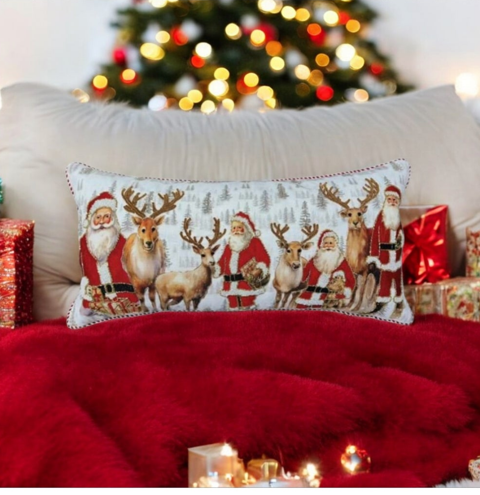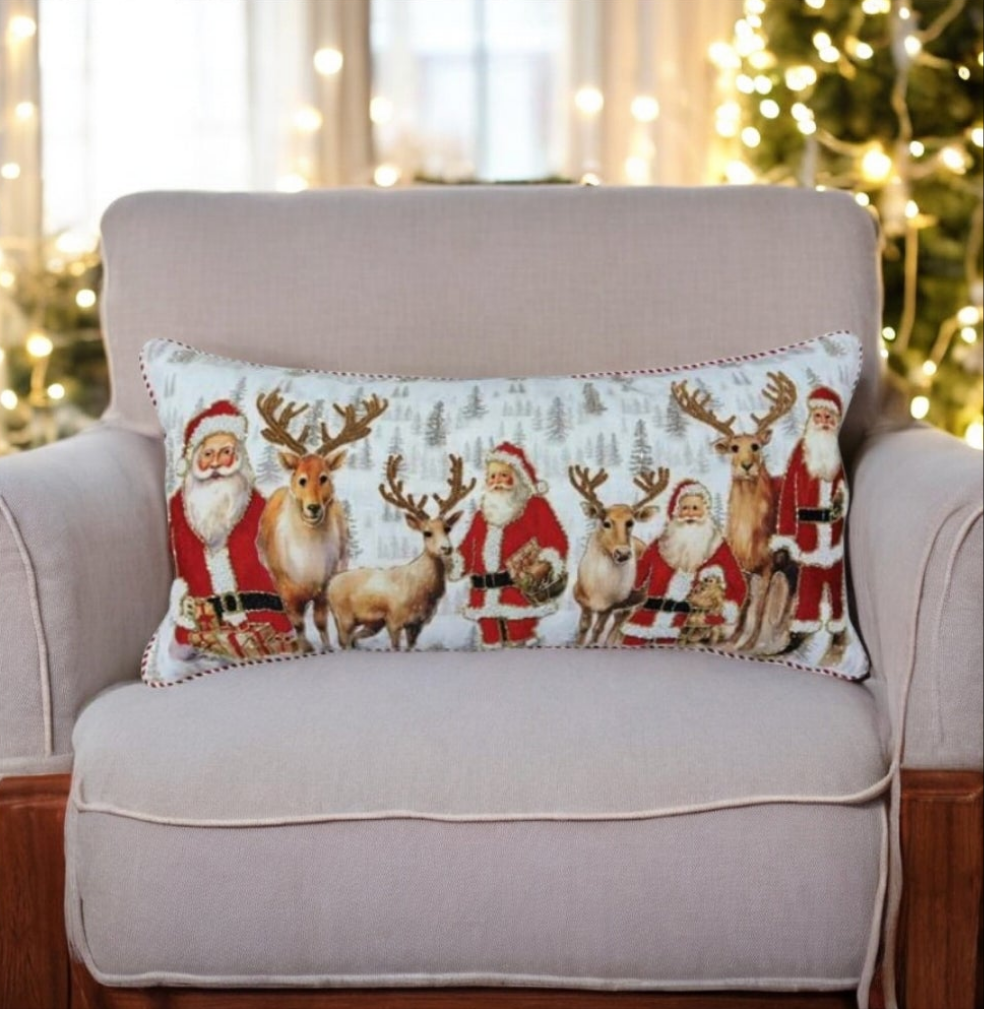 Cuscino natalizio rettangolare in gobelin , con splendida stampa natalizia con babbo natale e renne. Finemente ricamata con perline. Ideale per arricchire il divano o la poltrona del salotto con un tocco di eleganza e originalità.