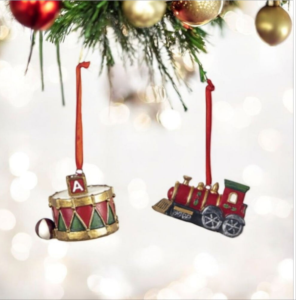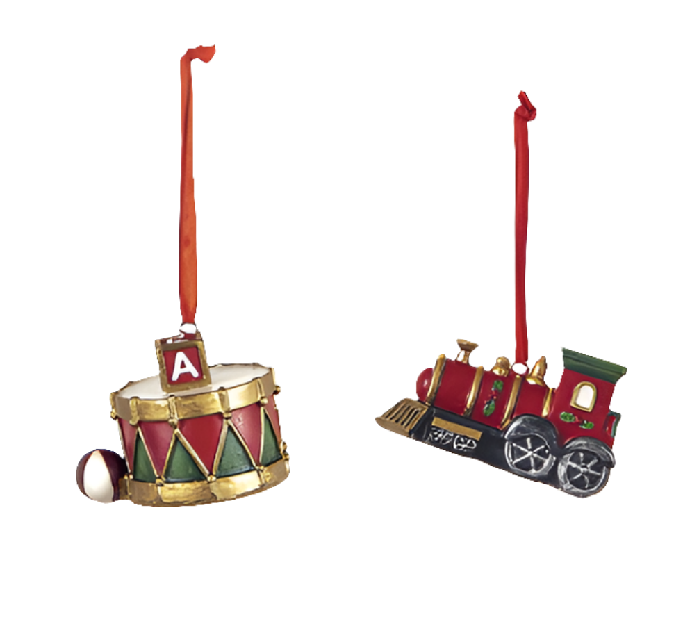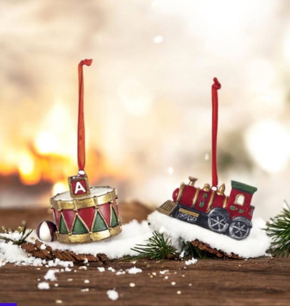 Decorazione natalizia in resina, da appendere, 2 soggetti a scelta A /B tamburo / locomotiva