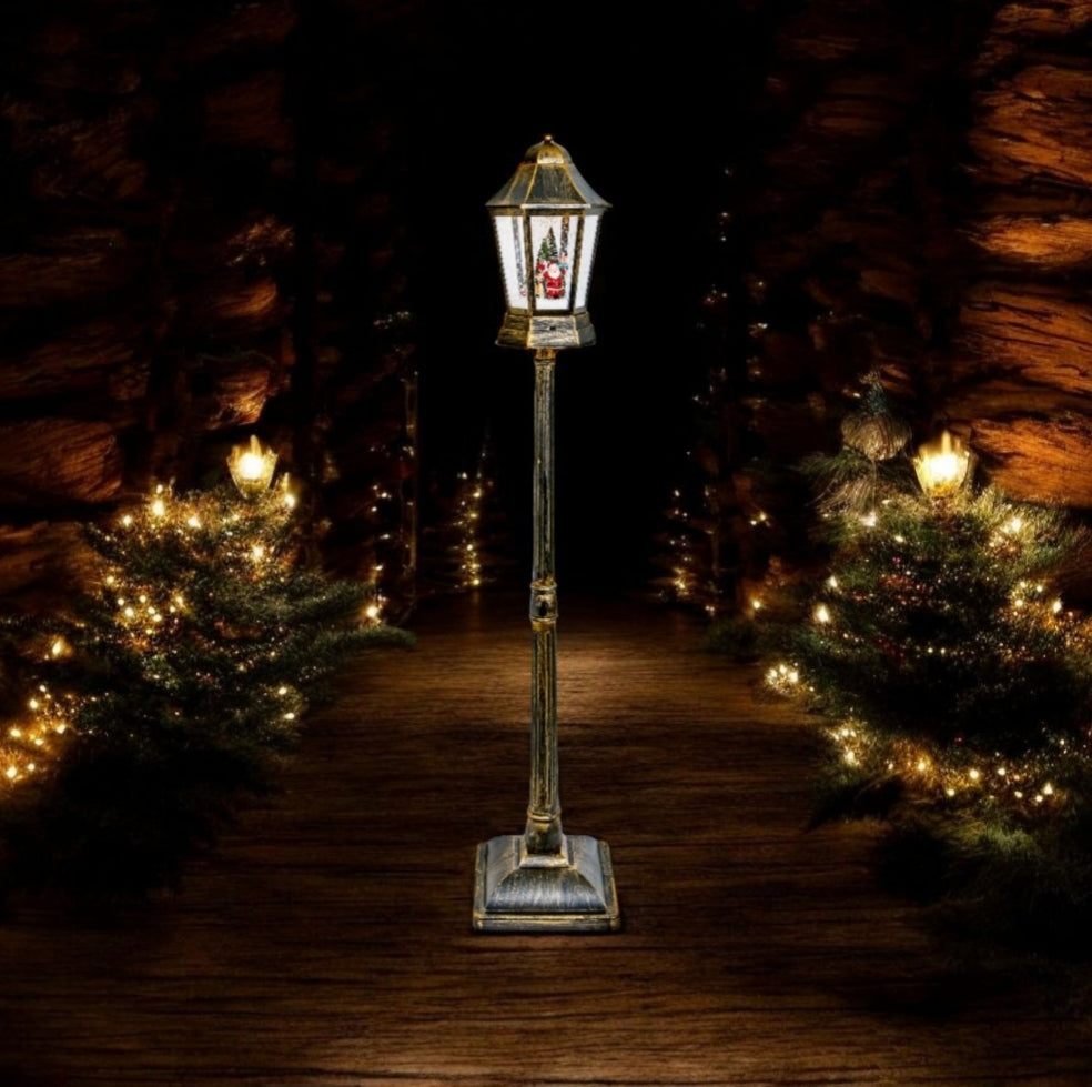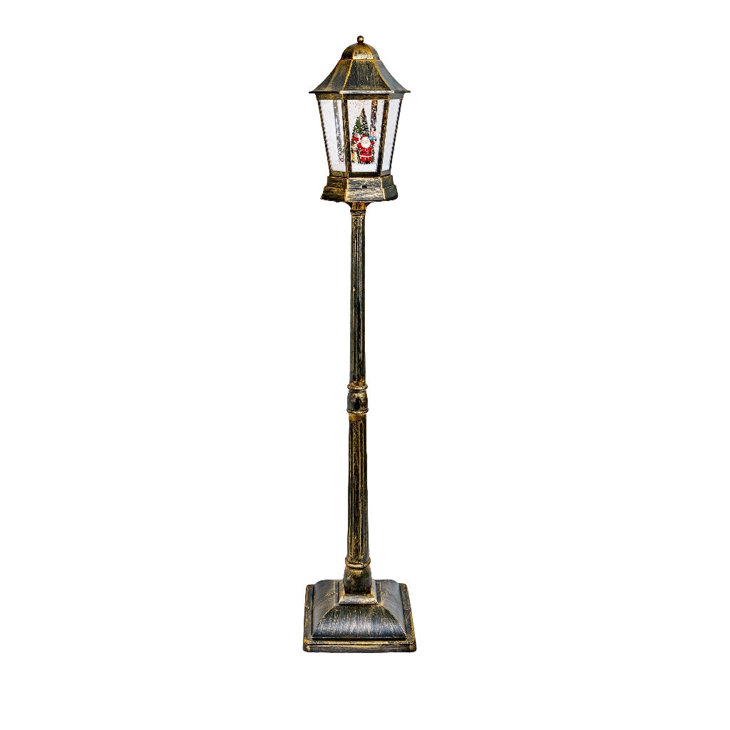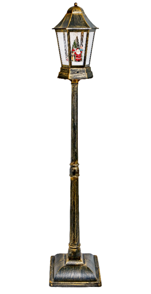 Lampione natalizio, con musiche, luci e ventola che fa girare la neve(polistirolo). Possibilità di escludere la musica lasciando comunque la ventola in movimento.