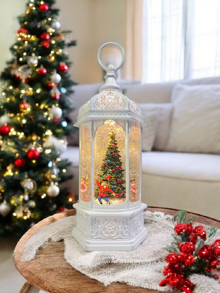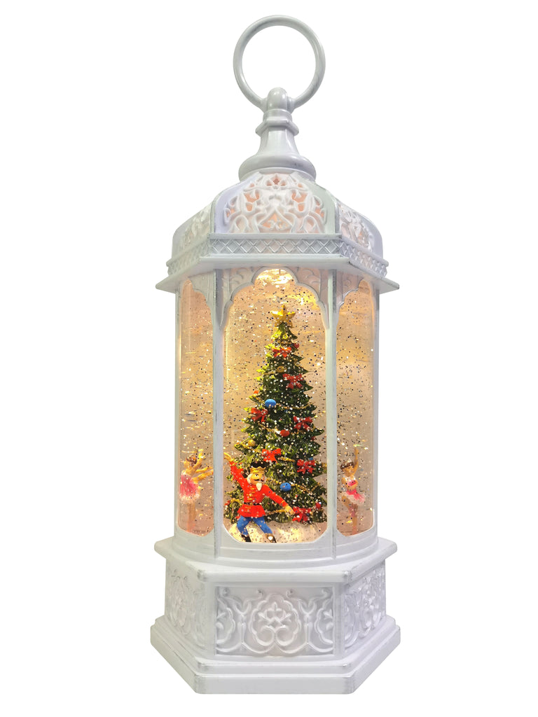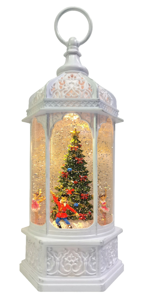 Lanterna natalizia carillon, con glitter e personaggi dello Schiaccianoci che girano attorno all'albero di natale.