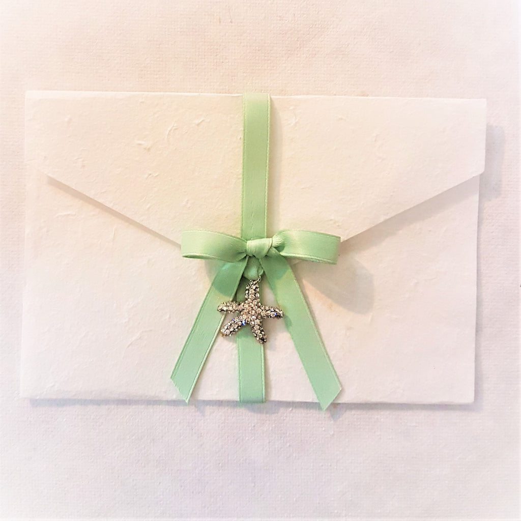 PARTECIPAZIONE IN CARTA COTONE BIANCA CON DECORO DI NASTRO IN COTONE COLOR TIFFANY E CIONDOLO STELLA MARINA IN METALLO E STRASS .