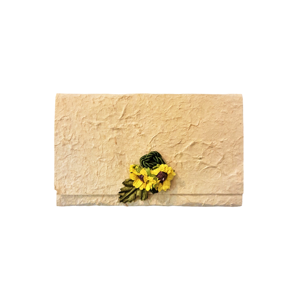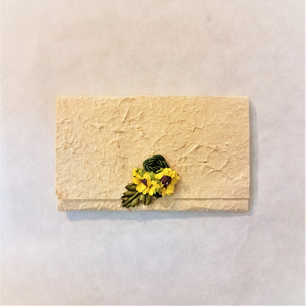 PARTECIPAZIONE IN CARTA COTONE BEIGE CON GIRASOLI E DECORO IN CORDONCINO VERDE.