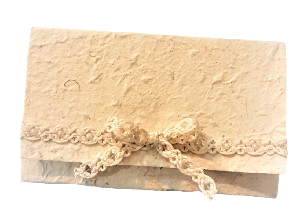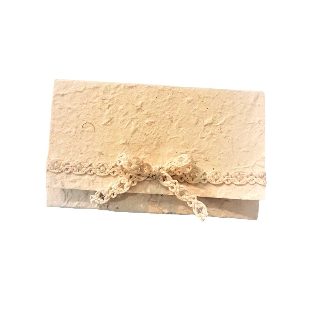 PARTECIPAZIONE IN CARTA COTONE BEIGE CON DECORO IN PIZZO DI COTONE COLOR AVORIO E PELINE .