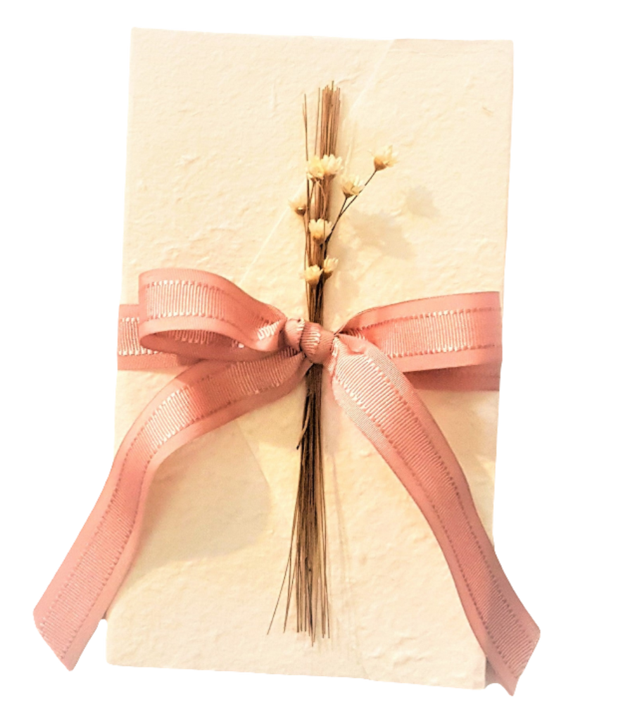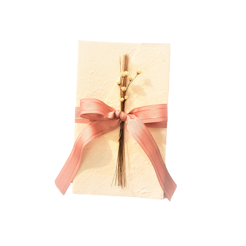 PARTECIPAZIONE IN CARTA COTONE BIANCA CON DECORO IN NASTRO ROSA ANTICO E GLIXIA.