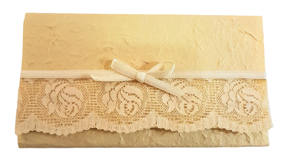 PARTECIPAZIONE IN CARTA COTONE AVORIO CON APPLICAZIONE PIZZO E NASTRO IN COTONE IN TINTA.