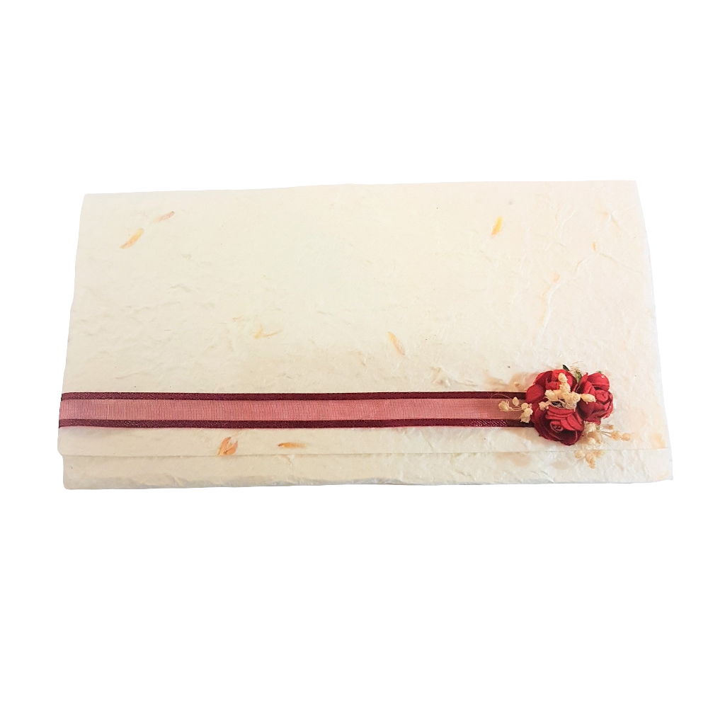 PARTECIPAZIONE IN CARTA COTONE BIANCA CON SEMI ESSICCATI PRESSATI, NASTRO BORDEAUX E ROSELLINE IN TINTA