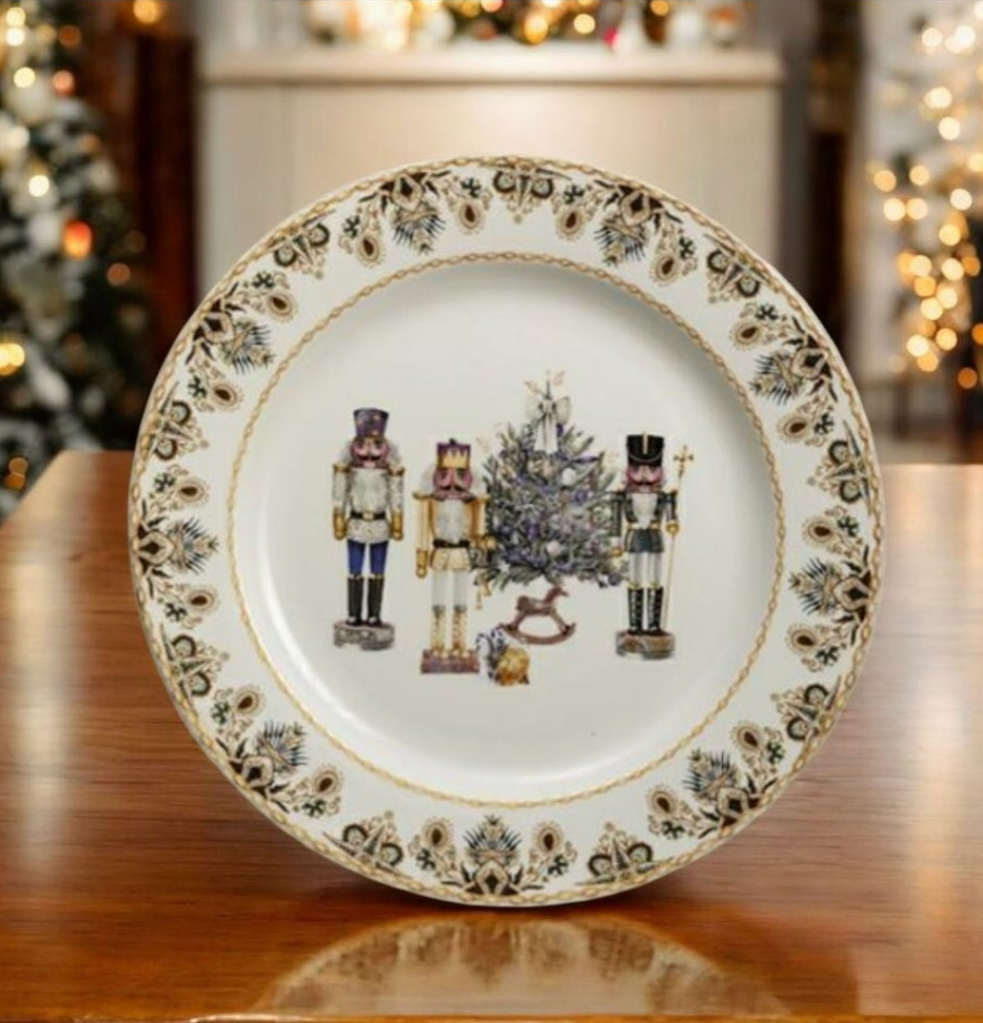Piatto natalizio, porta panettone, in ceramica con decoro schiaccianoci, scatola inclusa.