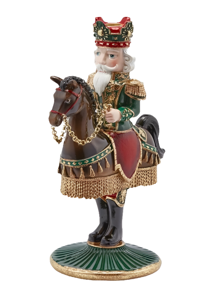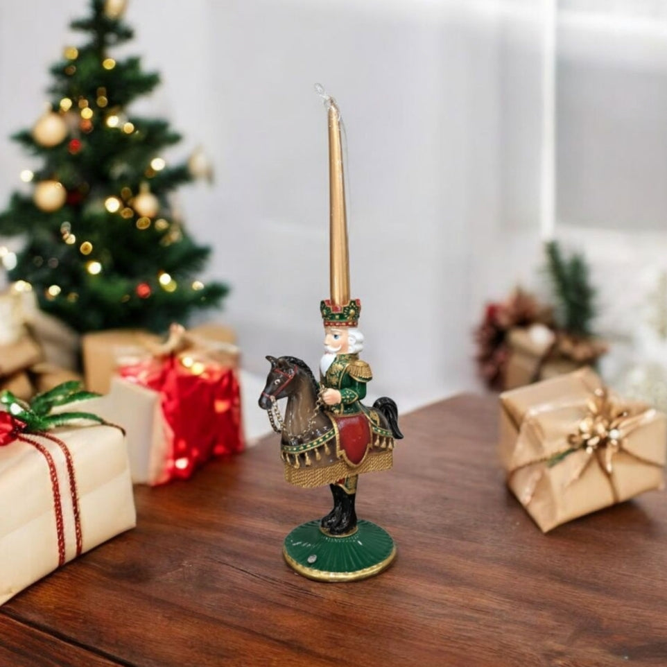 Portacandela soldato schiaccianoci a cavallo, in poliresina.