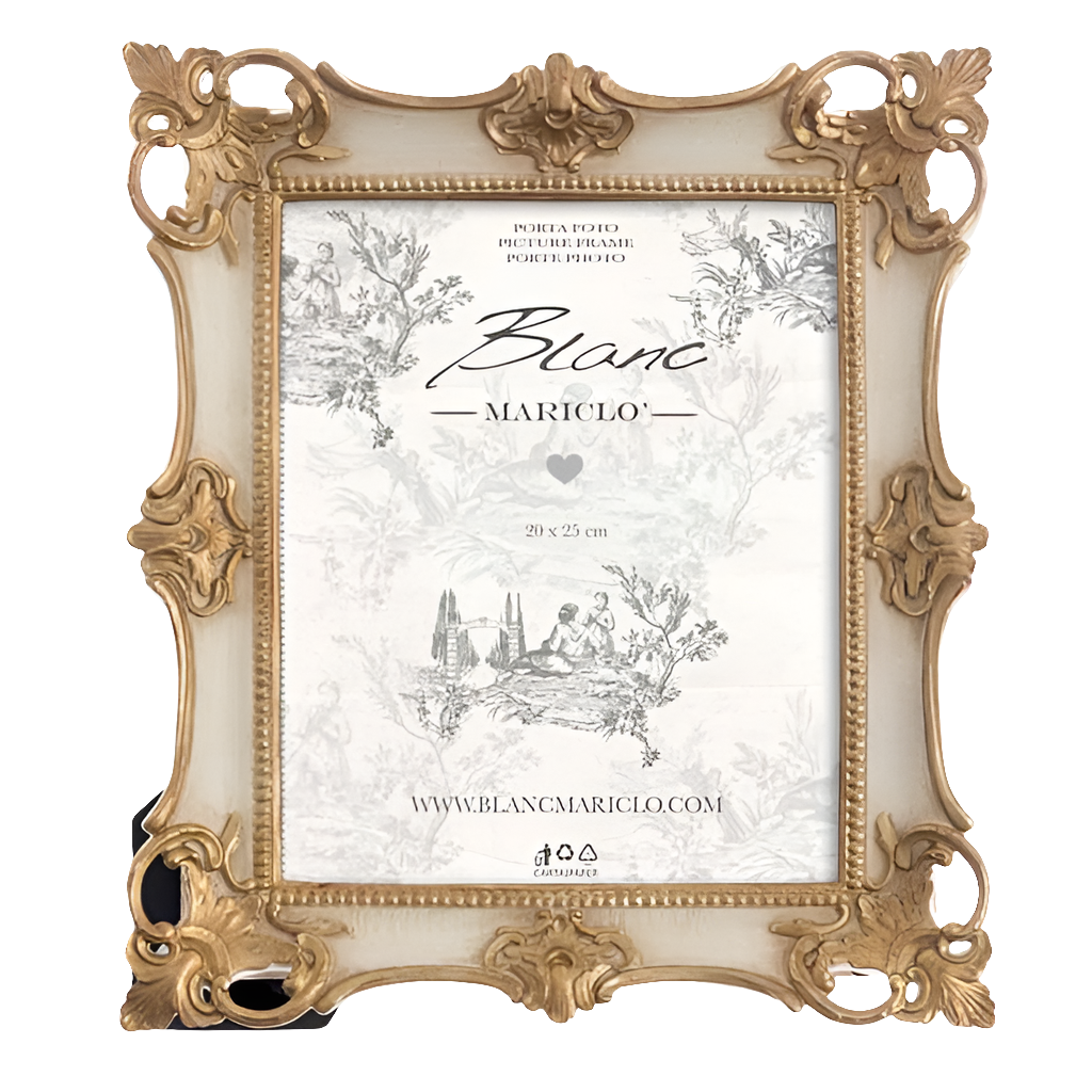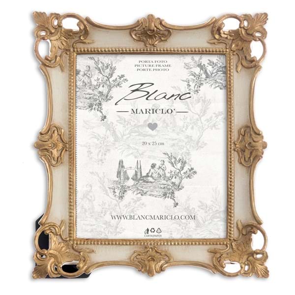 Portafoto grande, 20x25, sia da appoggio che da appendere, panna e oro, in legno e resina.