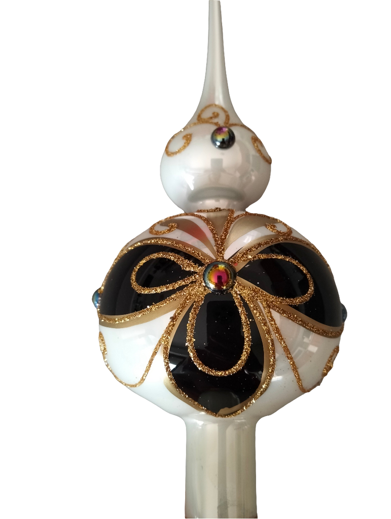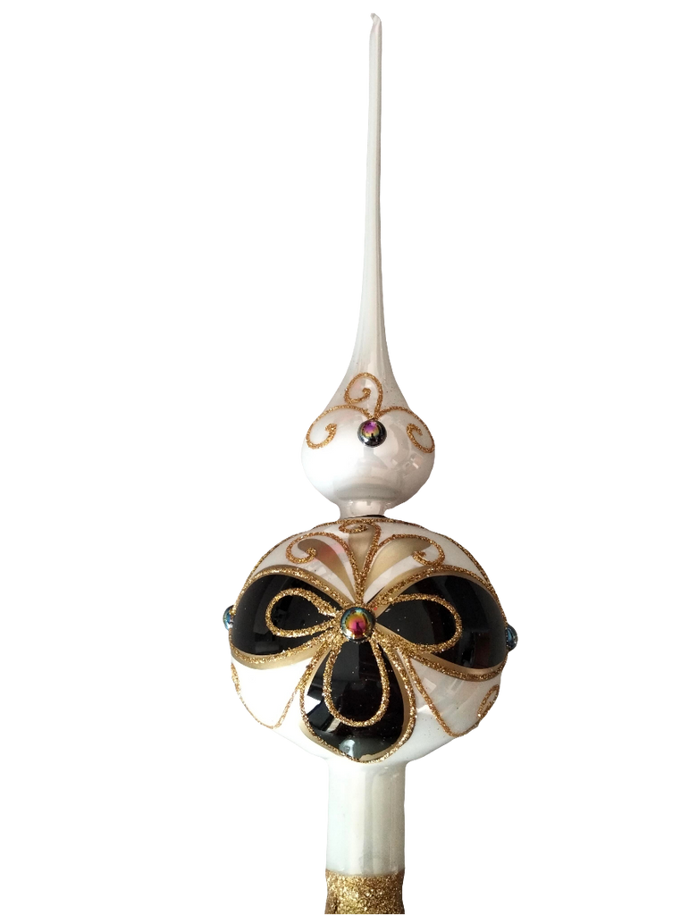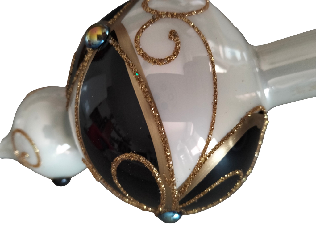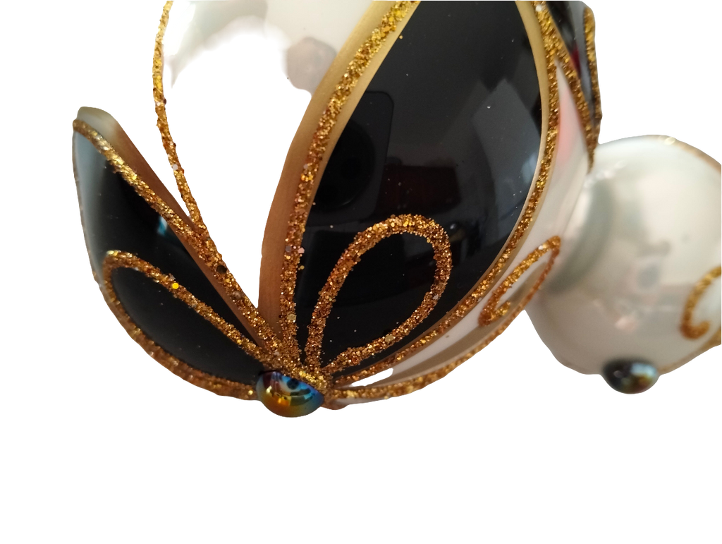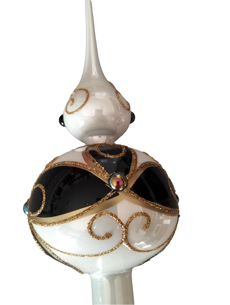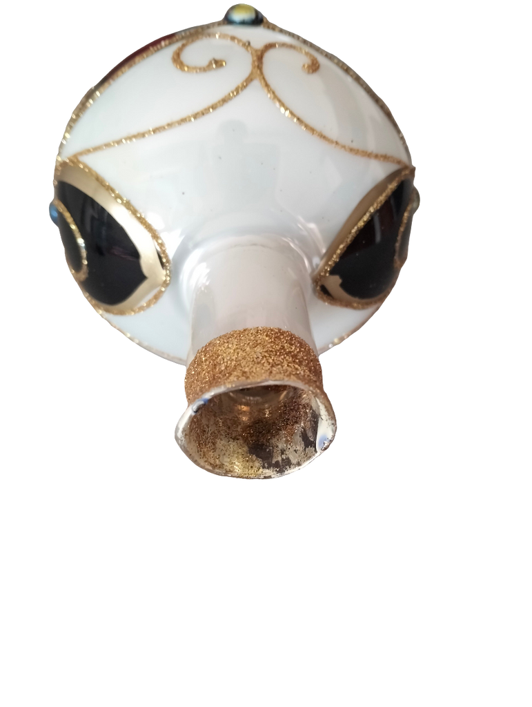 Puntale in vetro soffiato, bianco perlato con decorazioni nere e oro.