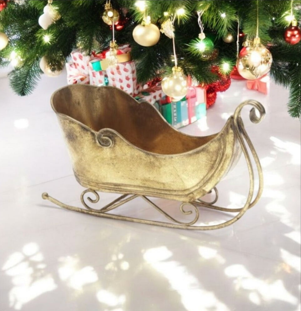 SLITTA DECORATIVA IN LATTA, COLOR ORO, IDEALE COME PORTA REGALI SOTTO L'ALBERO, O COME CENTROTAVOLA ARRICCHITA DI DECORAZIONI E LUCI.