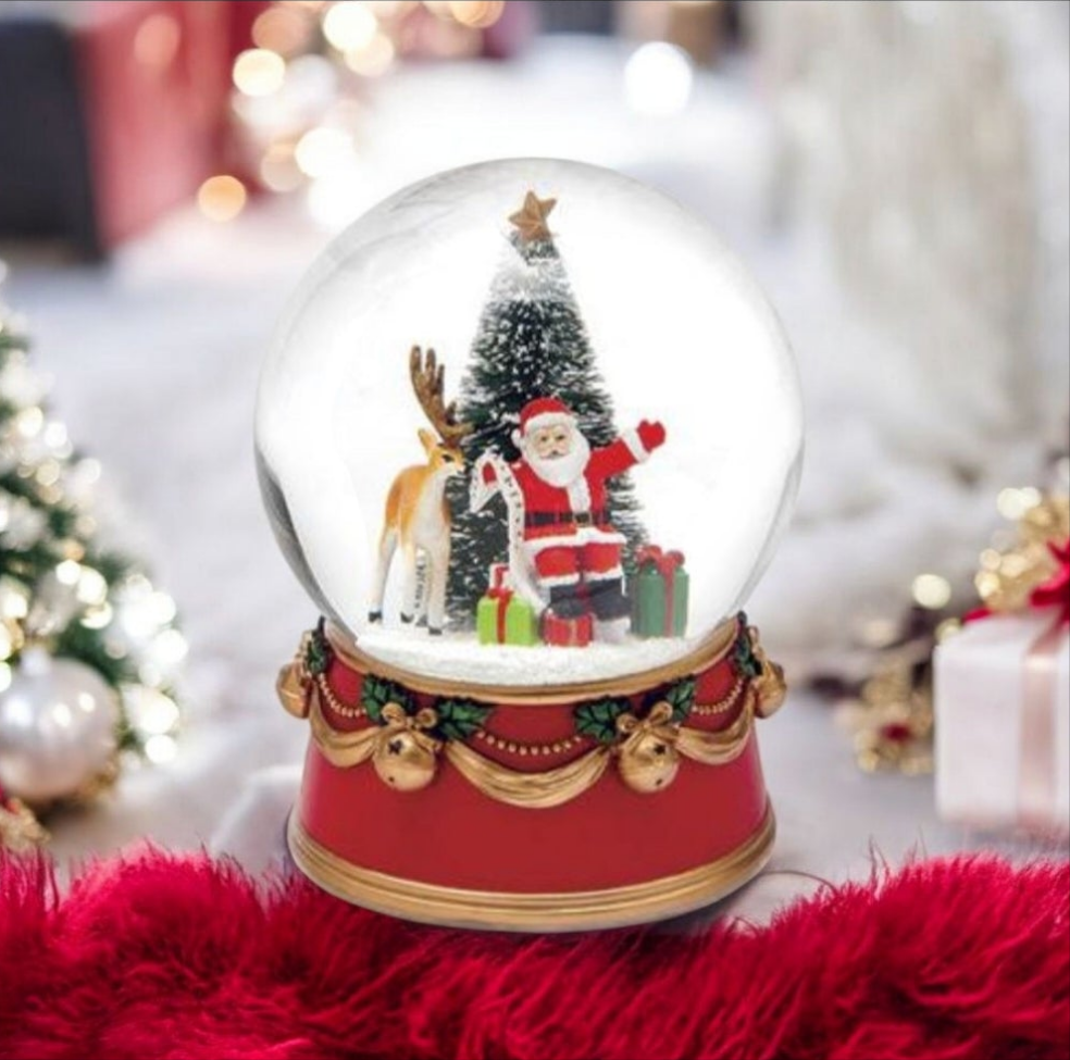 Snow ball carrillon natalizio con babbo natale e albero, in resina e vetro. Carica manuale, scena fissa senza rotazione o movimenti.