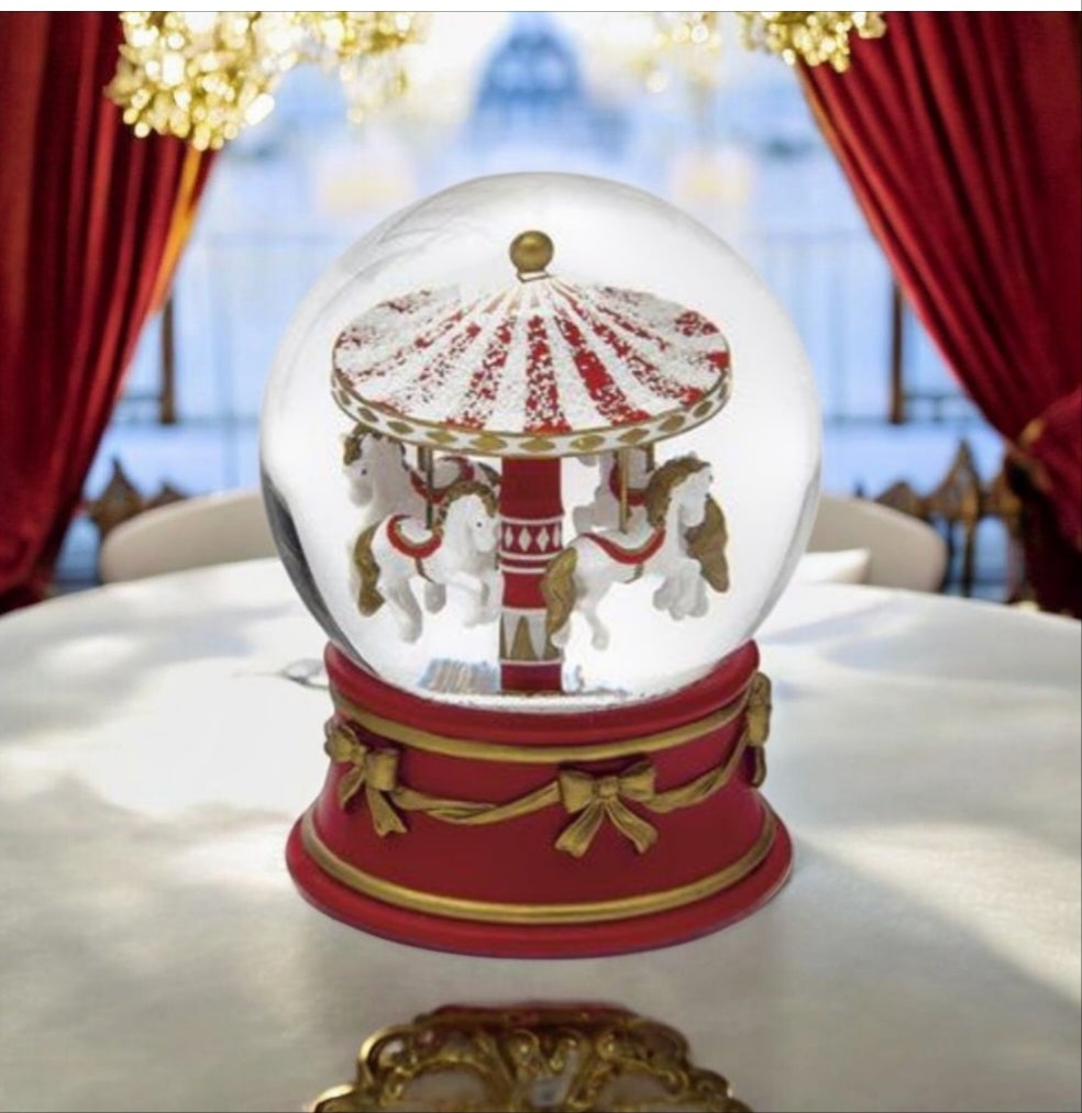 Snowball carillon natalizio con carosello, in resina e vetro. Carica manuale, immagine fissa, senza movimenti.