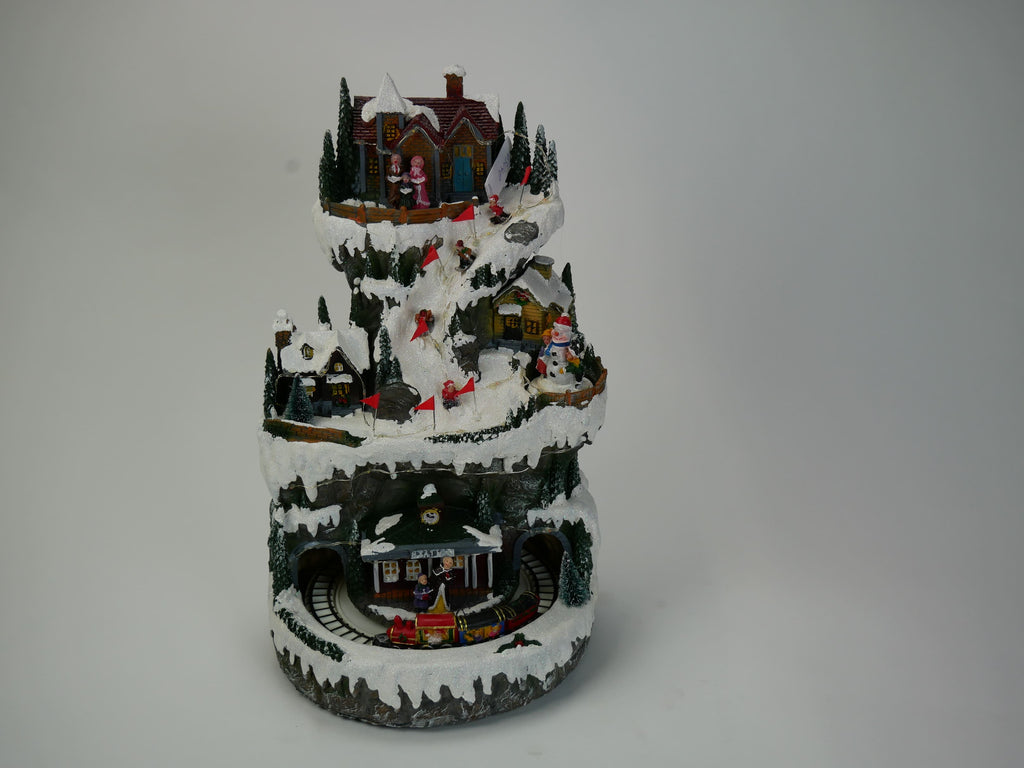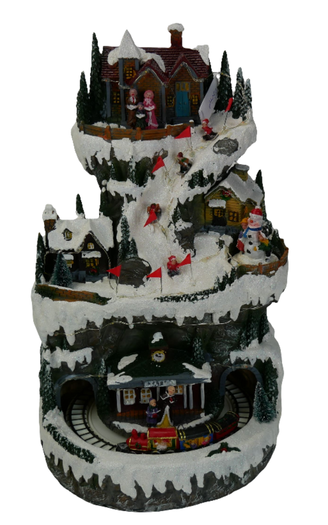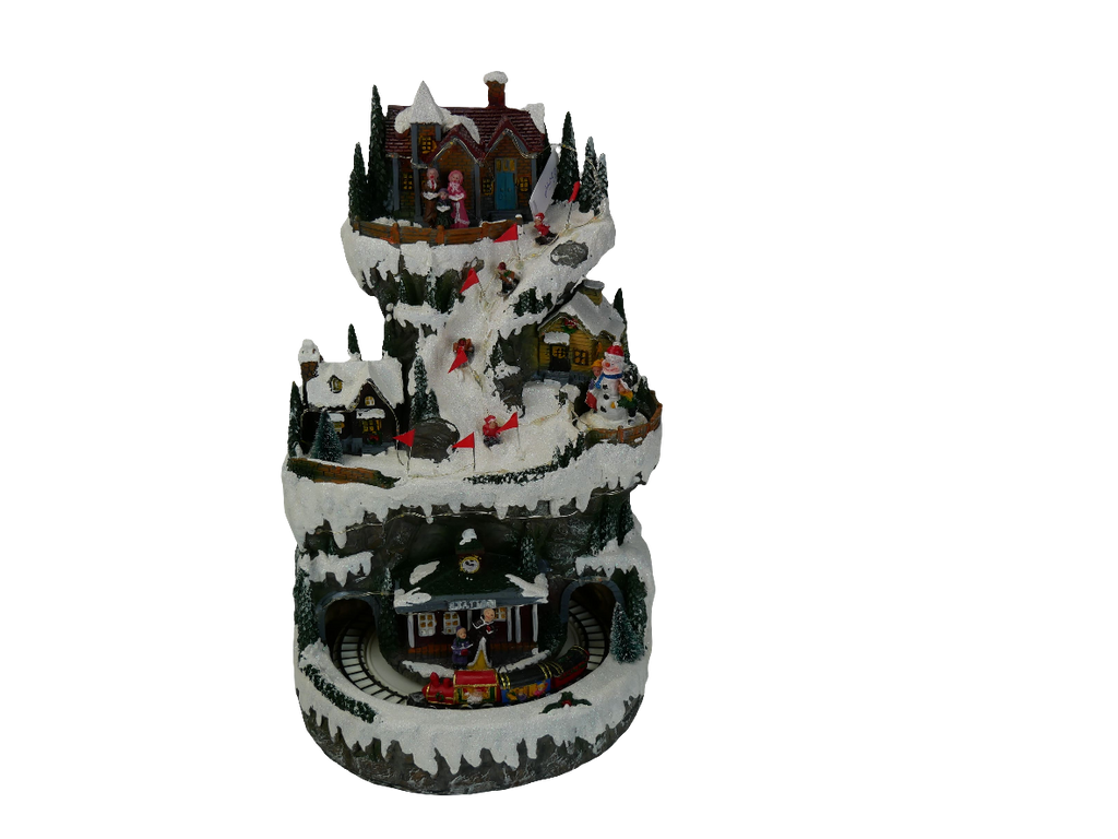 Villaggio di montagna illuminato, suona 8 melodie diverse mentre i bambini girano sul ghiaccio e anche il treno gira. Interruttore a 3 vie (svolta con illuminazione - spenta - svolta con illuminazione e musica). Azionamento con cavo USB in dotazione (adattatore non incluso)
